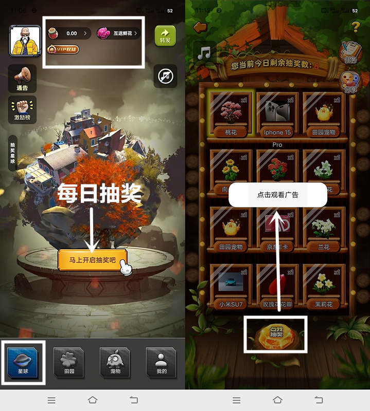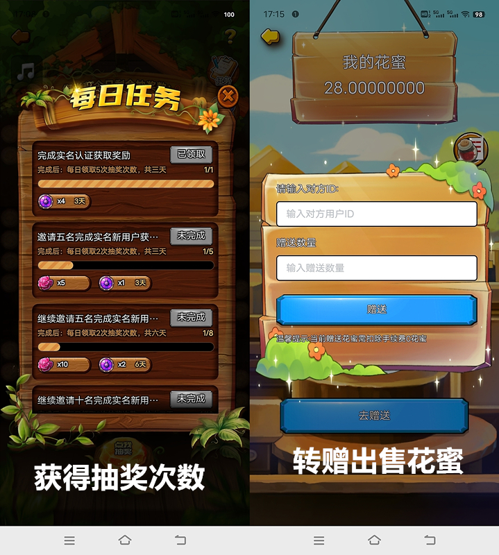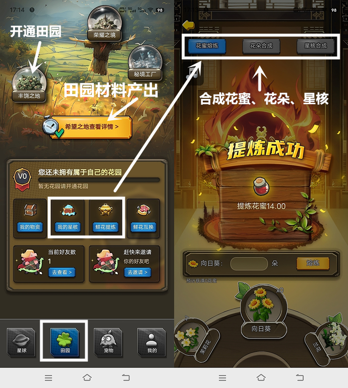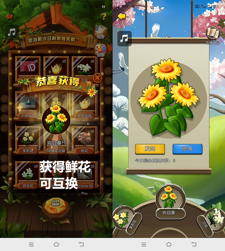 二、抽奖获得花瓣、鲜花(可互换),花瓣合成鲜花,鲜花合成星核,鲜花兑换花蜜转赠