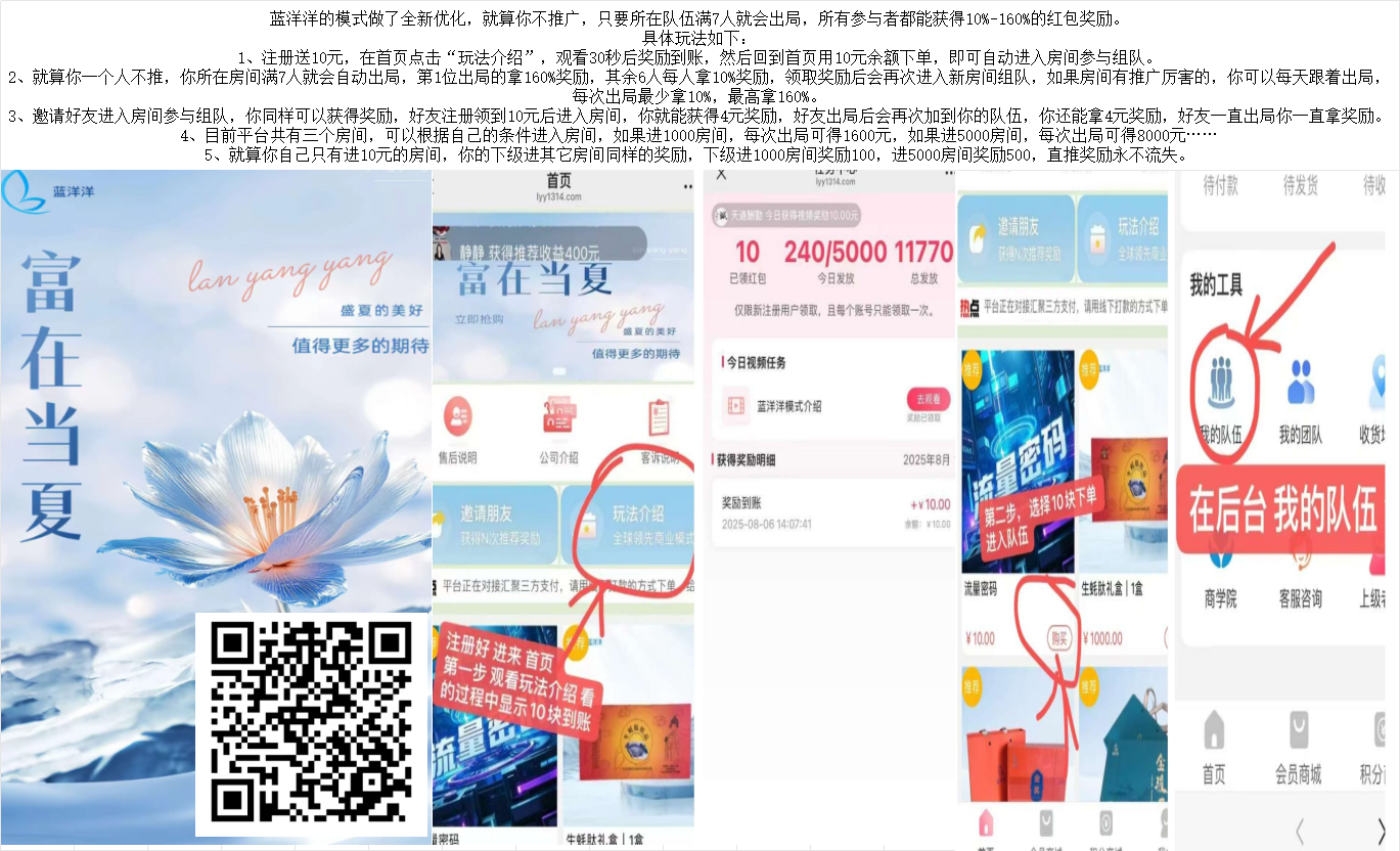零撸站队 蓝洋洋的模式做了全新优化,就算你不推广,只要所在队伍满7人就会出局,所有参与者都能获得10%-160%的红包奖励。