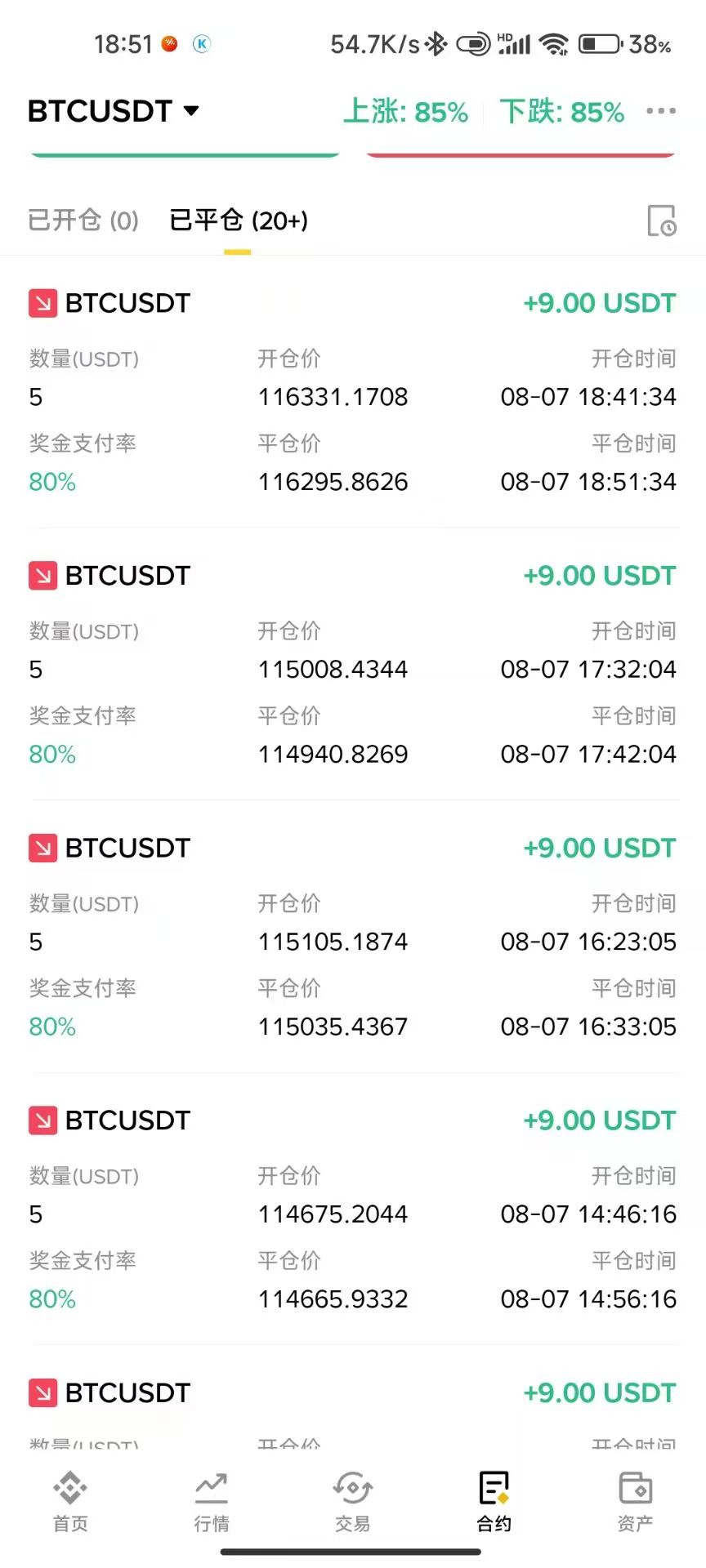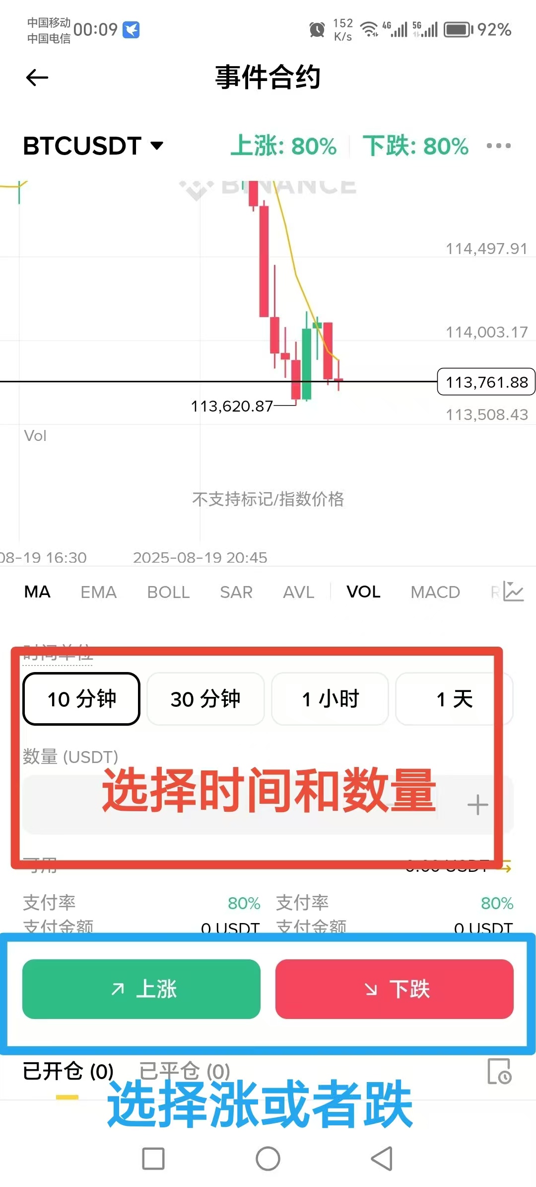 三,选择时间和数量,然后选择涨或者跌,猜对了有85%的利润