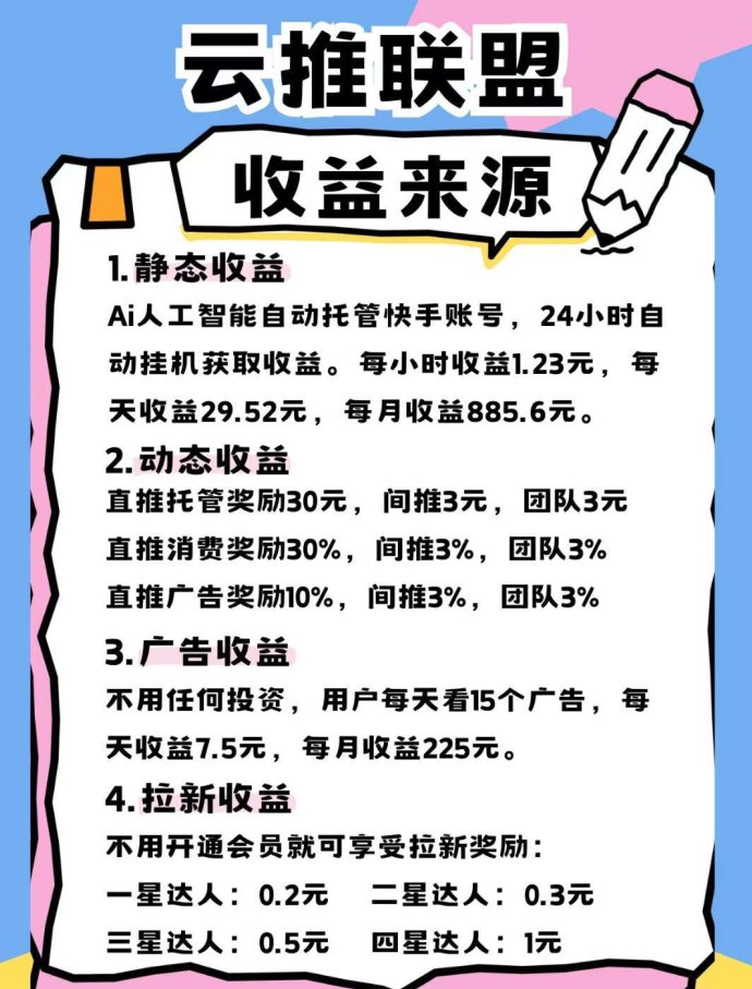 操作简便,注测即可上线,后台自动执行任务,无需手动搬砖,长期稳定收溢。无论你是新手还是副*业达人,都可以通过云推联盟抖音关赞评项目,实现自动化收入,轻松赚取每日固定收溢,稳稳坐享互联网红利。