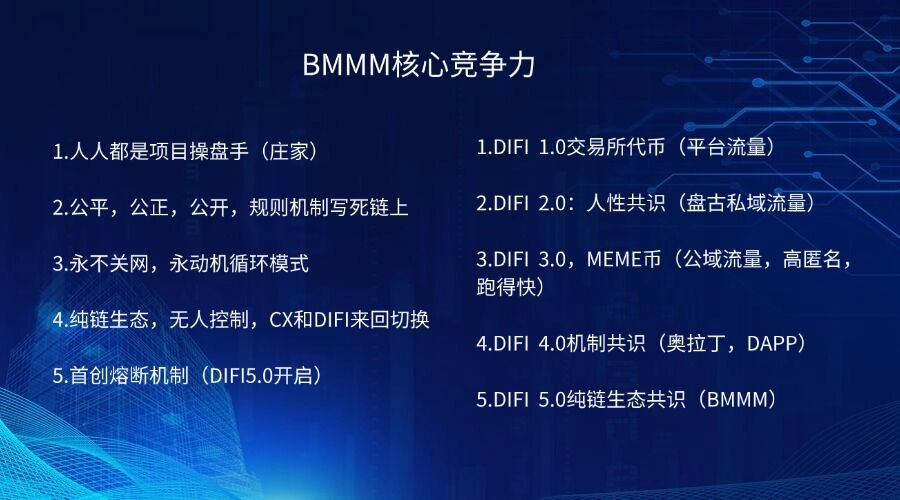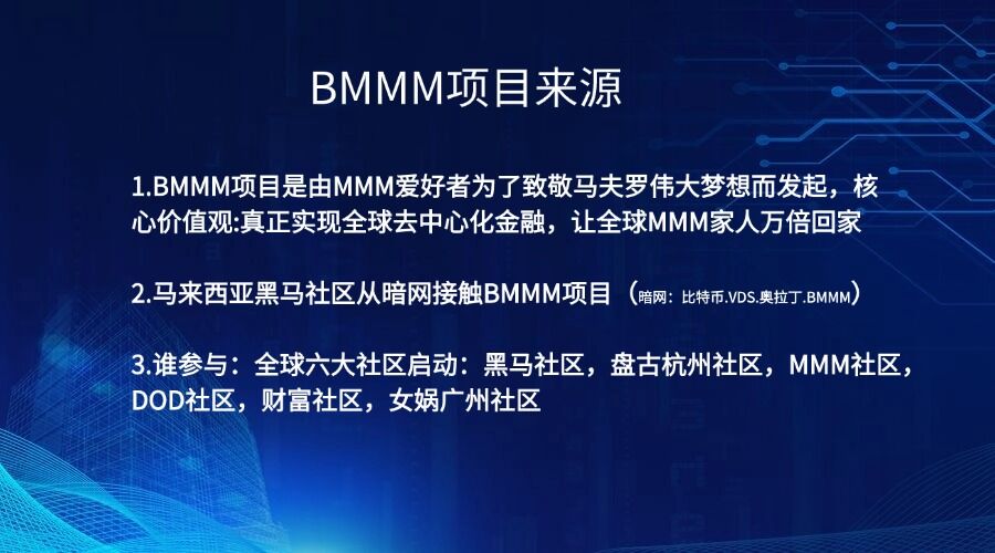 1.BMMM项目是由MMM爱好者为了致敬马夫罗伟大梦想而发起,核心价值观:真正实现全球去中心化金融,让全球MMM家人万杯回家