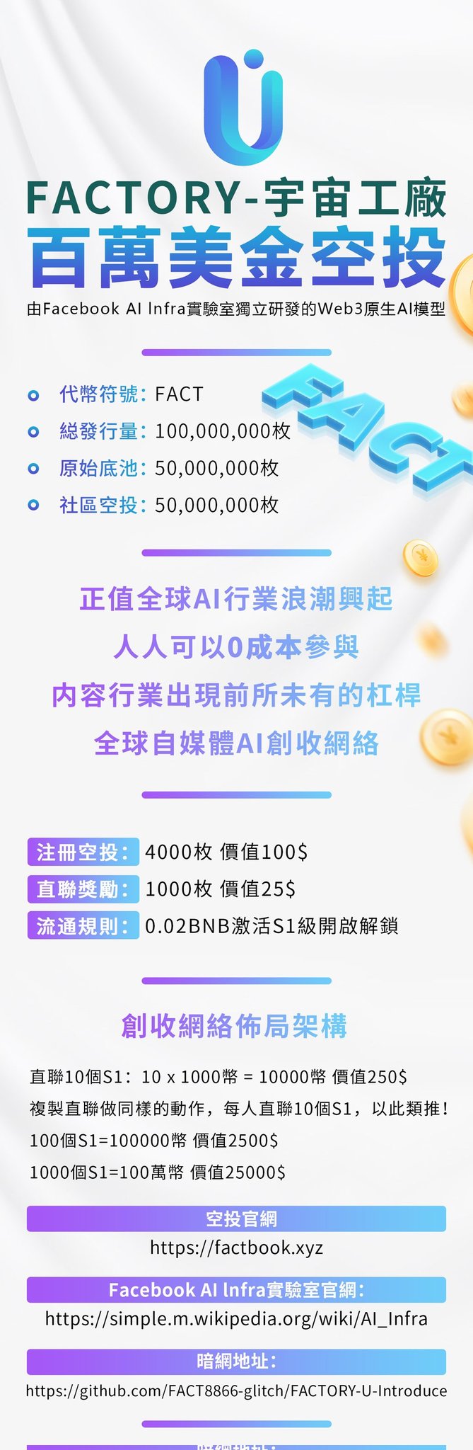 头K首码绝逼项目 看懂赶紧上车 红利期 锁粉速度 纯零撸4000枚代B:无需手*费 慢一分钟多一万 首码宇宙工厂注册就送4000FACT(价值100油)直推一人送1000FACT(价值25油) 全网公排送万人团队,占位就赚web钱包和tp钱包BNB b安链打开:https://factbook.xyz/#/?code=DO5MZNC6ICCC