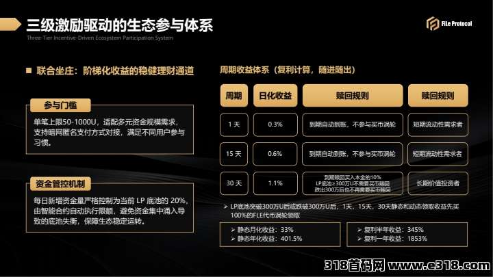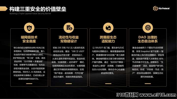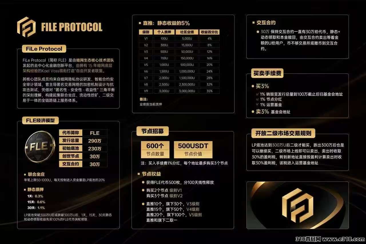 File Protocol (FLE) 全球首码:*技术 + 极致通缩,打造团队长专属“财富管道,一个由*顶级技术团队打造,自带“越用越少”稀缺属性,并为你量身定制了“静态+管道+级差”三重收益的DeFi财富项目。