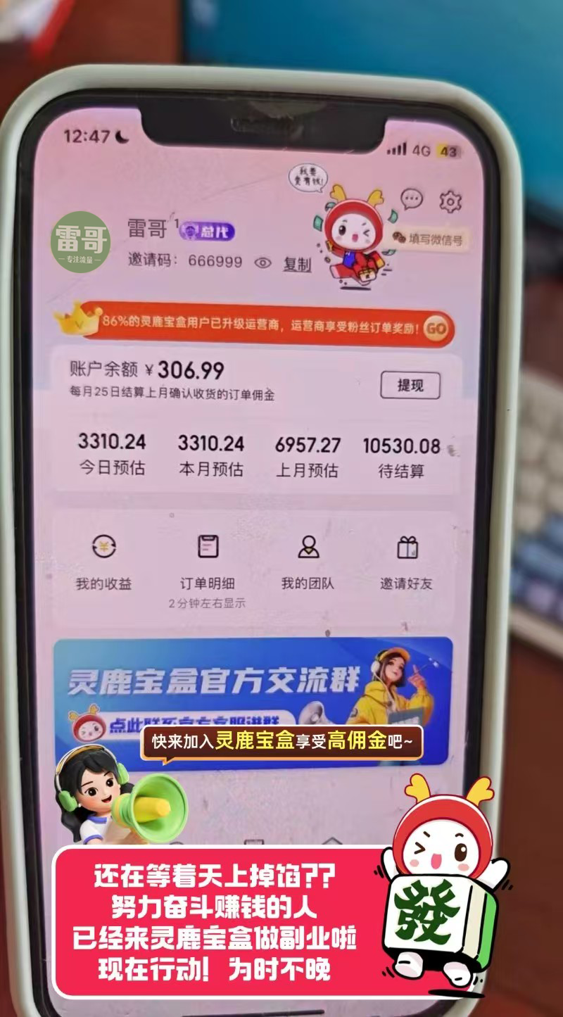 可能有人担心体现麻烦,这点完全不用慌。灵鹿宝盒满 0.1 就能体现,而且 0 手*费,商品收货次月 25 号到月底就能提,我每次体现都是当天到账,特别靠谱。平台后台还能实时看收益明细,邀请了多少人、拿了多少分成,一目了然,数据特别透明。
