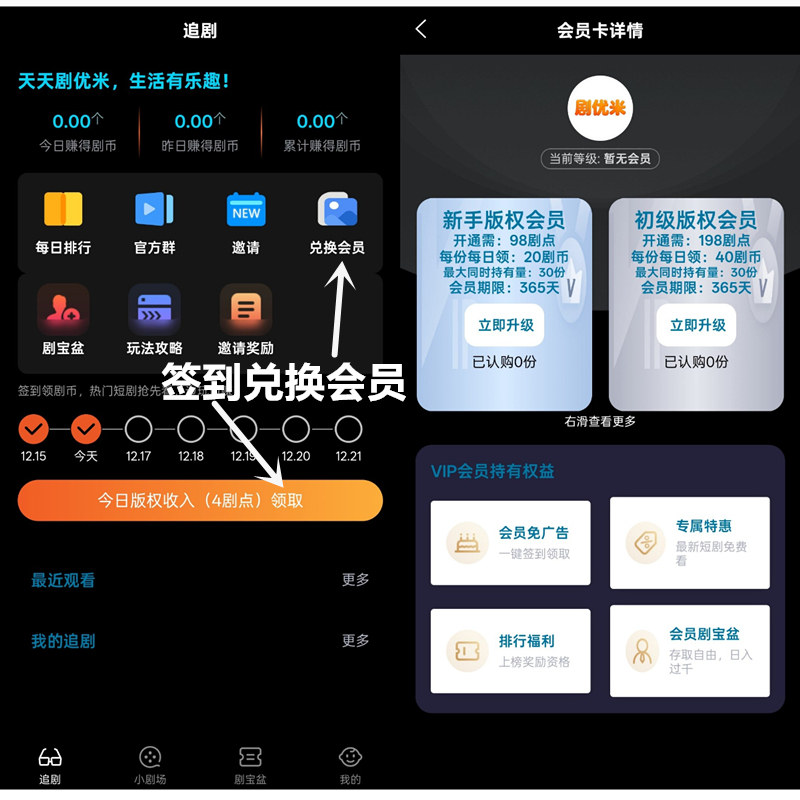 一、首页每天签到领取据点,据点满98个兑换版权会员