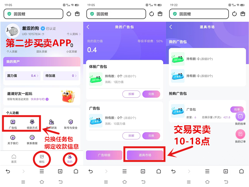 五、我的-广告包-道具市场(买卖圆力)10:00-18:00,我的-设置收k信息