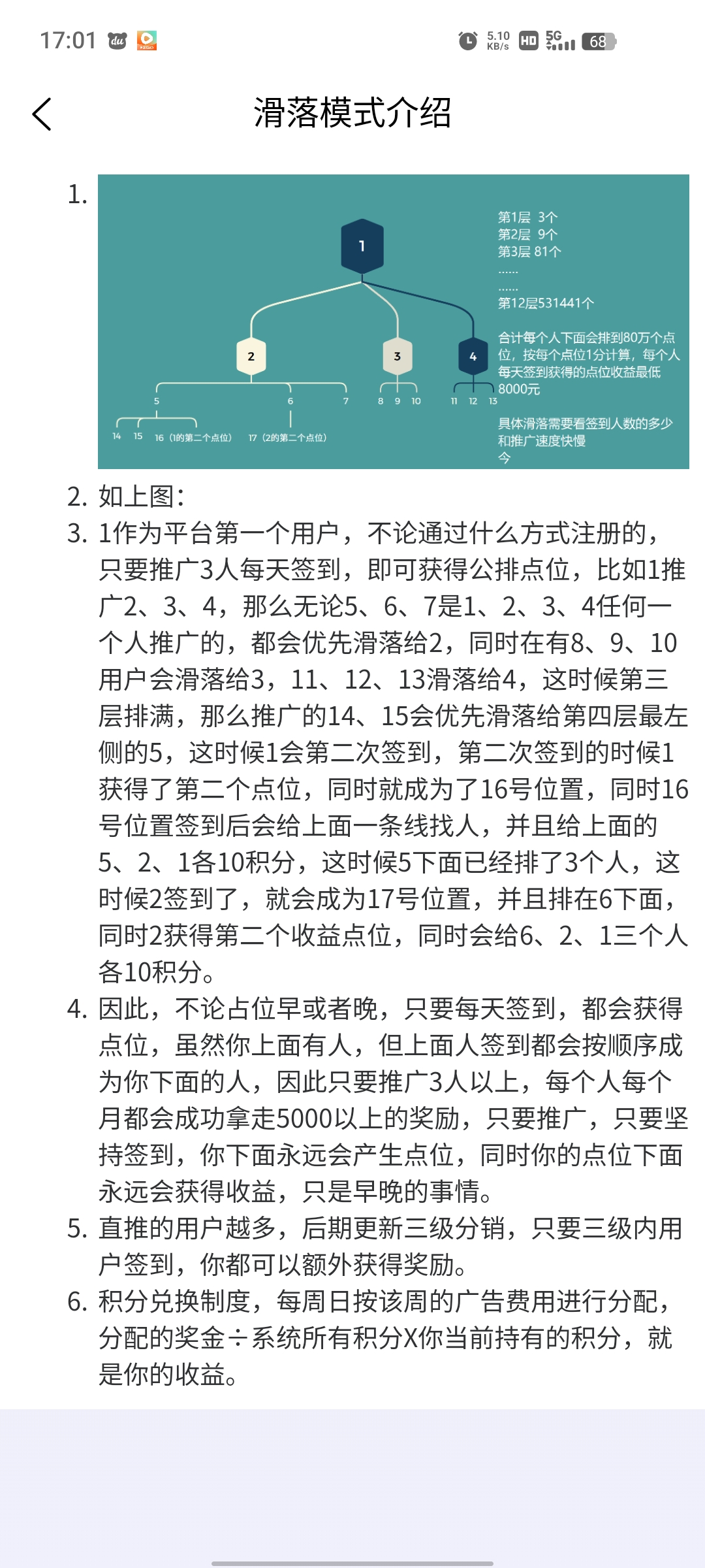 1、每天看6个广告完成签到后,获得100积分,同时也获得一个公排点位,按全网公排,三三复制排列,滑落到伞下一个点位,获得10点积分,总共可获得80万个点位。