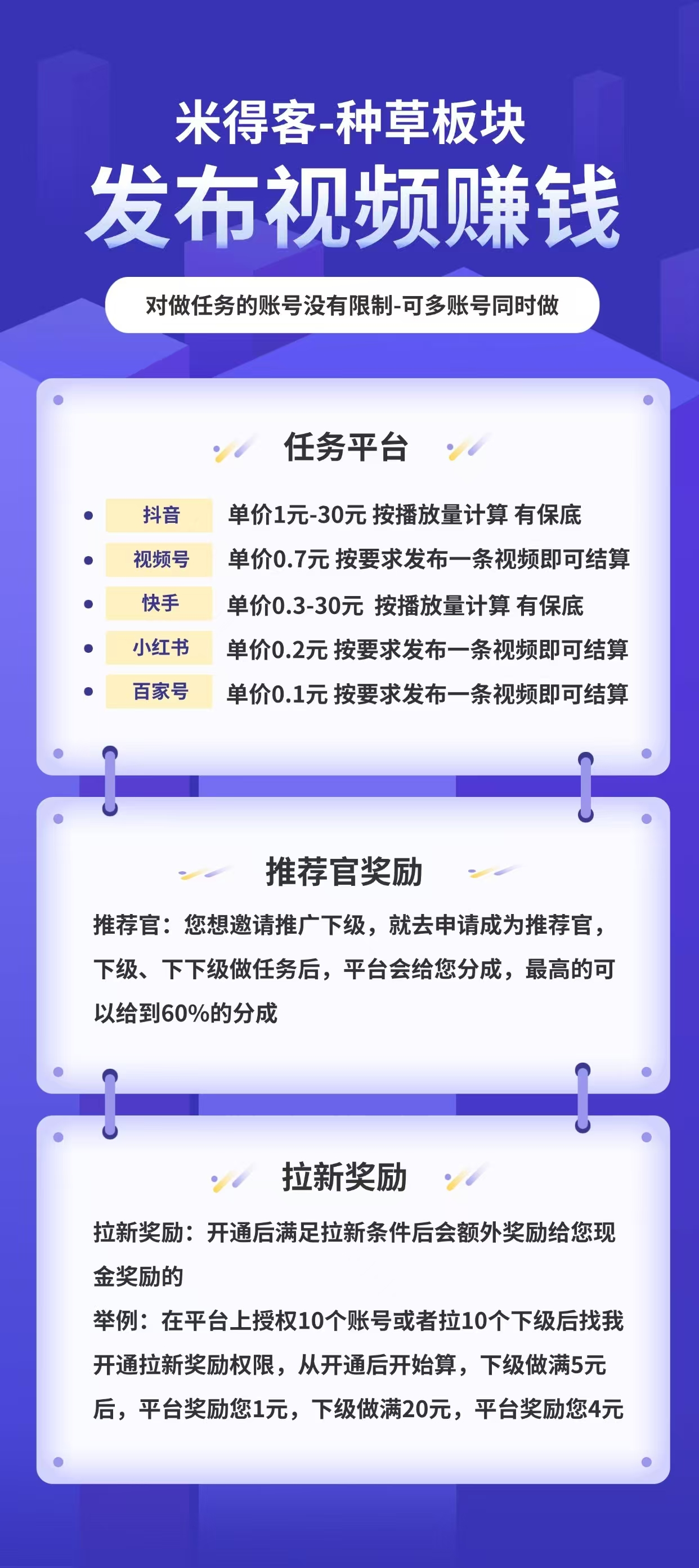 发布视频就能赚钱得一个平台,每天任务随时可以做,全天都有。