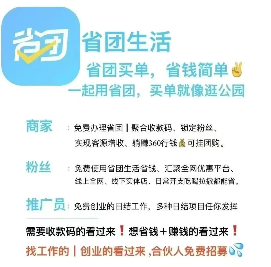 省团生活力争打造全国最大的真商异业联盟,布局线上线下360行的生态体系,让商家、消费者、推广者三方共赢的商业模式。从23年内侧上线到现在全国已经入驻60万商家,已经锁定千万消费群体,几万地推铁军每天奔赴一线市场,省团已到了黄金发展时期。从最开始只有聚合收k码业务,伙伴收入比较少,到如今赚钱板块非常多,日入过万的大团队长有不少,支*付宝碰一碰设备、点餐码、联通卡、代运营、POS机等等,未来省团一片光明!