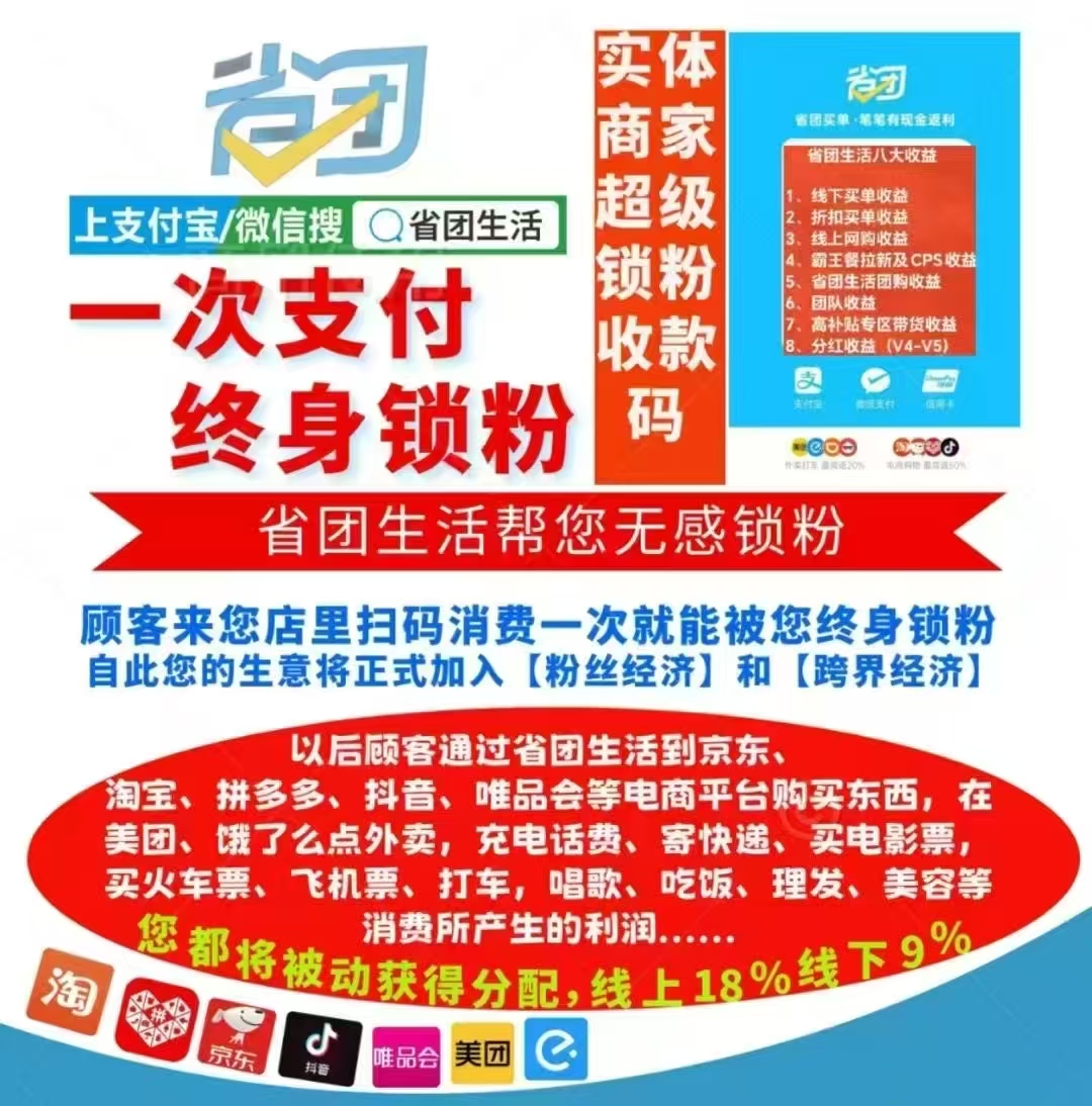 省团线上版本包括各大主流电商平台:淘宝、京东、拼多多、美团、电影票、加油、充话费等等,消费者都可自用省钱,推广者拿长久返佣,轻松打造周边五公里实体商圈精准推送,助力实体商家引流曝光。