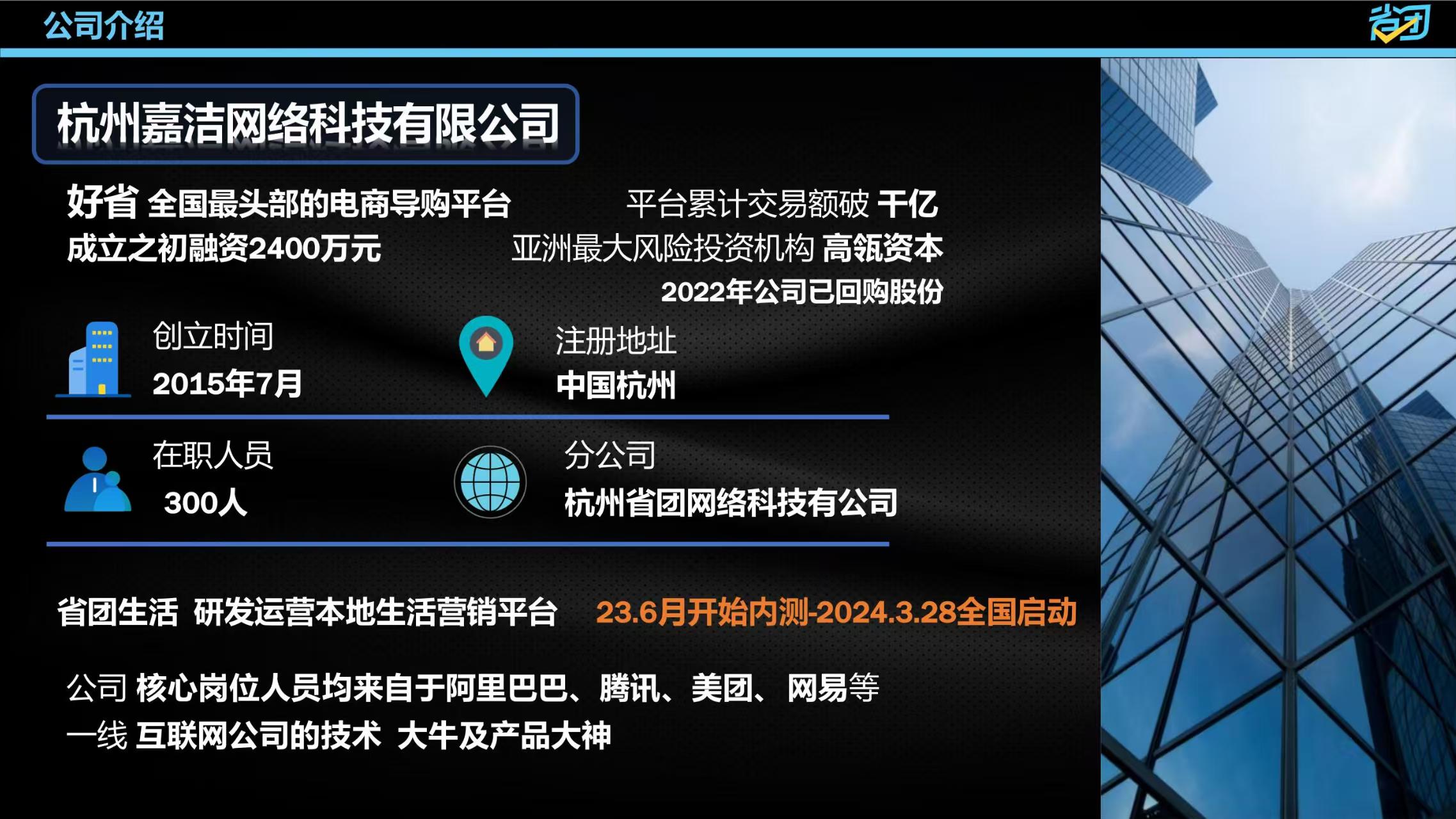省团生活是由杭州省团科技有限公司研发运营的一个本地生活营销平台,公司隶属于“好省"总公司杭州嘉洁网络科技有限公司。好省总公司成立于2015年7月,成立之初融资2400万元,平台累计交易额已经破干Yi,是全国最头部的电商导购平台之一,最大投资方为亚洲最大的风险投资机构高瓴资本(2022年公司已回购股份)。