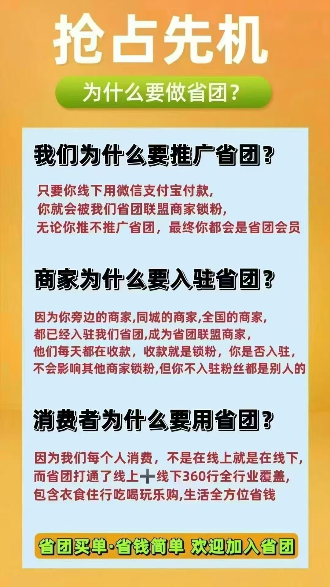 省团生活只要你看懂了就去做,这是一个属于自己创业的平台,早做早赚钱,你就是你团队的第一人,所有利益最大化,当然新人前期我们要不断的学习,然后付出行动,无论你是推人还是推店都可以,找到适合自己的方向,三代出黑马,六代出老鹰,同路人永远在路上,同时做省团选对推荐人,团队很重要,我们聚势系统为省团最大团队之一,人才济济,能跟团队老大联系联系,保持第一手信息,商学院,社群,线上线下培训随时赋能,只要你愿意深入学习。