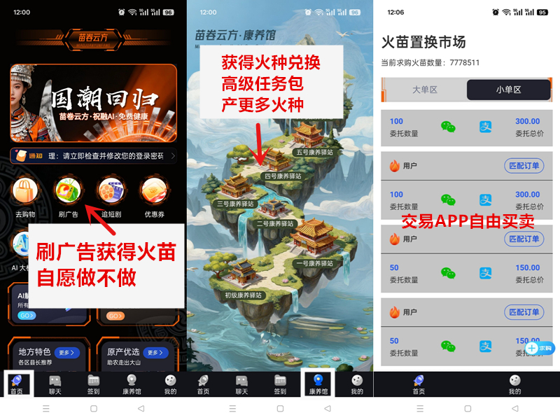 三、下载交易APP,把火种转换成火苗买卖1:1扣健康值(购买火苗1:1获得)