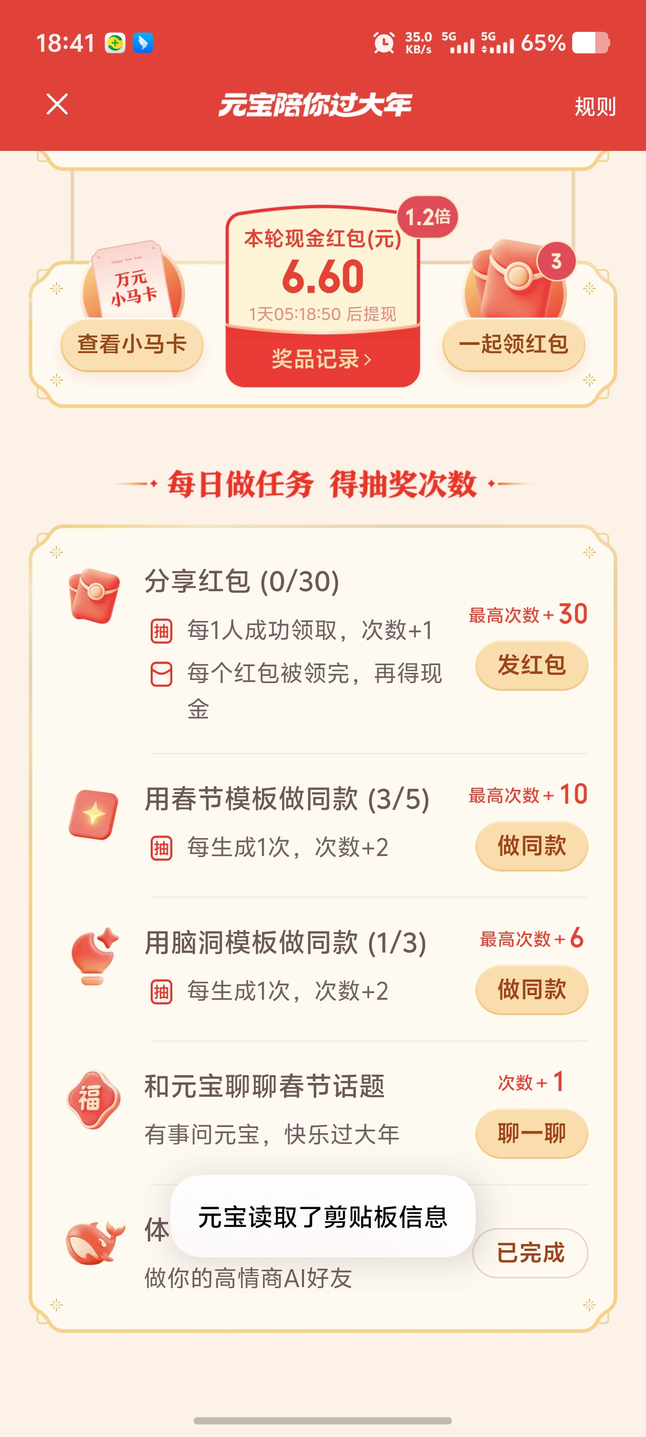 腾讯元宝过年福利来了快来一起集卡赢大奖! 2026年02月02日 119 zhuzi123 发消息 腾讯元宝推出迎新活动啦! 集卡就能拿到小马卡赢取一万奖励,抽卡金额随机抽取。 做任务可获抽卡次数 想参与的朋友联系方式,咱们一起助力多得次数! QQ2734517028 对本文有疑问,请注册登录后,发消息,联系作者! 交流QQ群:1147670845,交流首码app:首推啦 文章来源: zhuzi123 本文地址: https://shoumaquan.com/post/86515.html