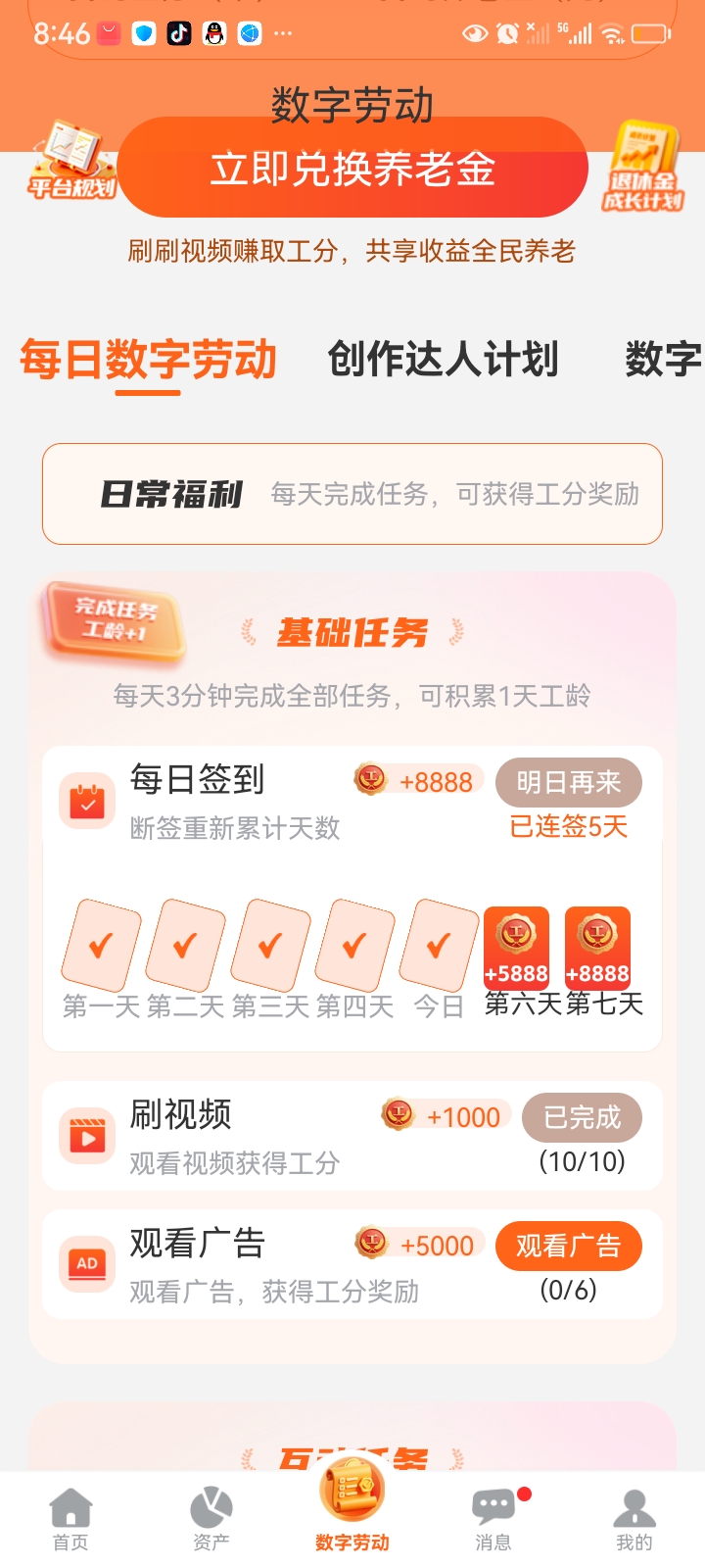 (2)数字劳动页面签到下面观看六个广告即可👈