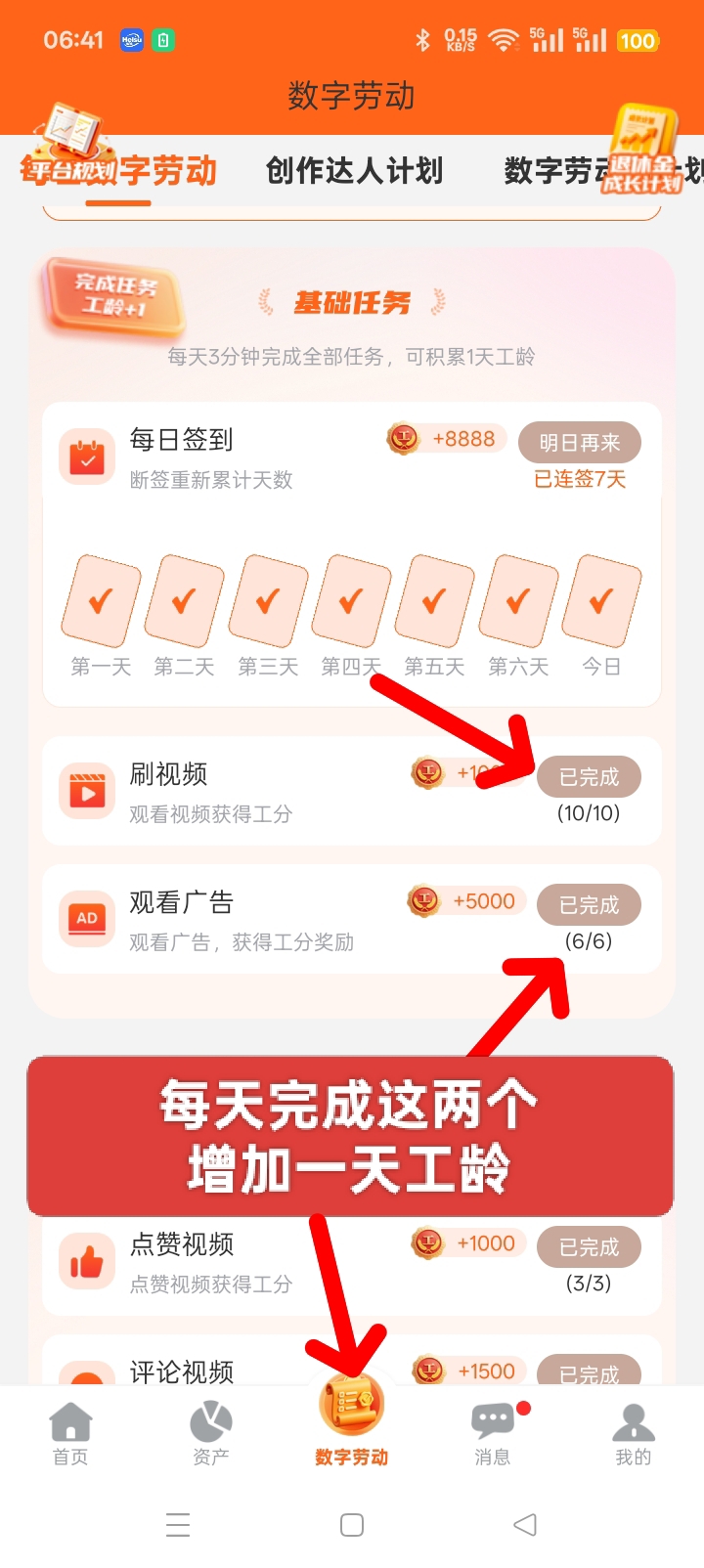 ✔每天任务包括:发视频,刷视频,点赞,评论,关注,看广告(一个5毛的工分)等自由参与,非强制任务。