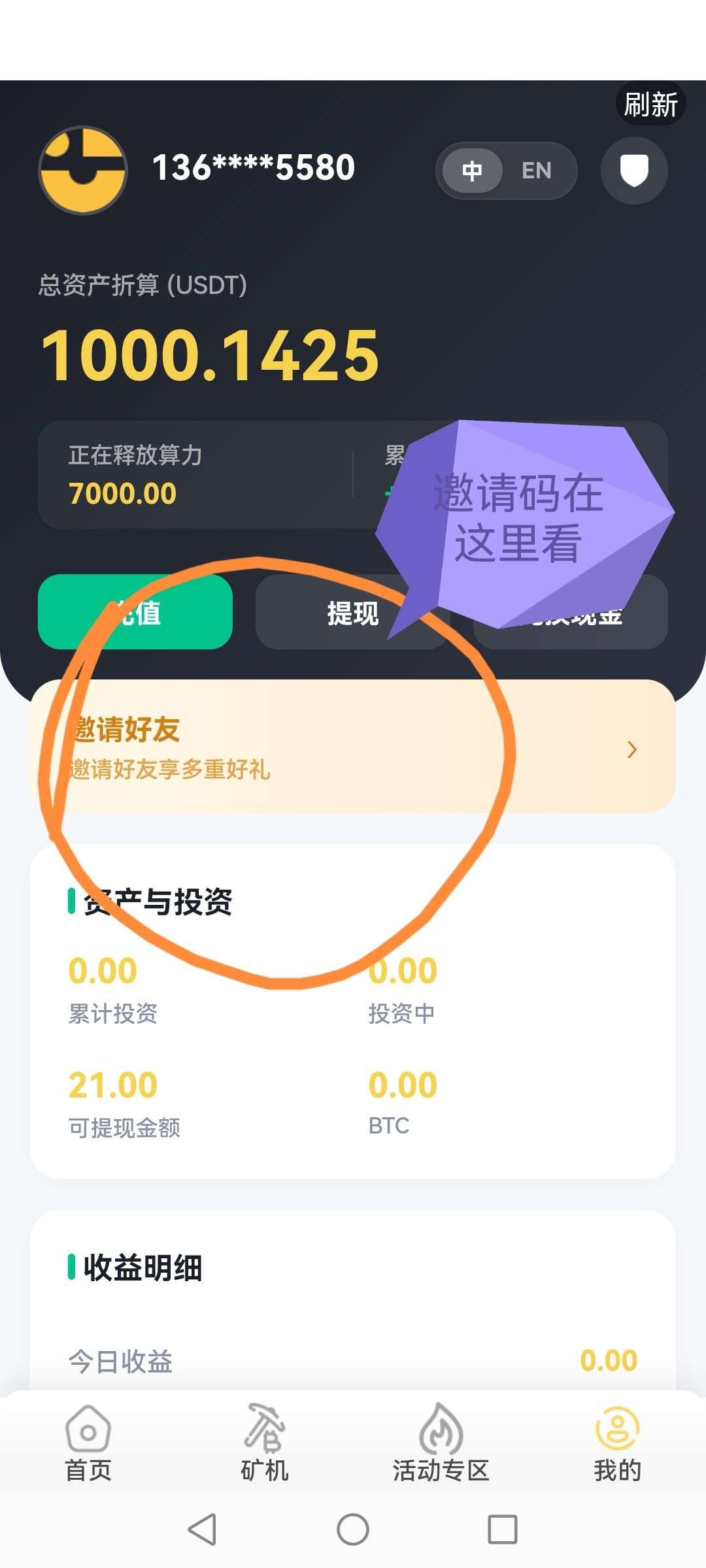 注册15+签到5+随机算力1-688,第一天能有21+的收益,但是平台需要25体现,也就是说第二天必定体现