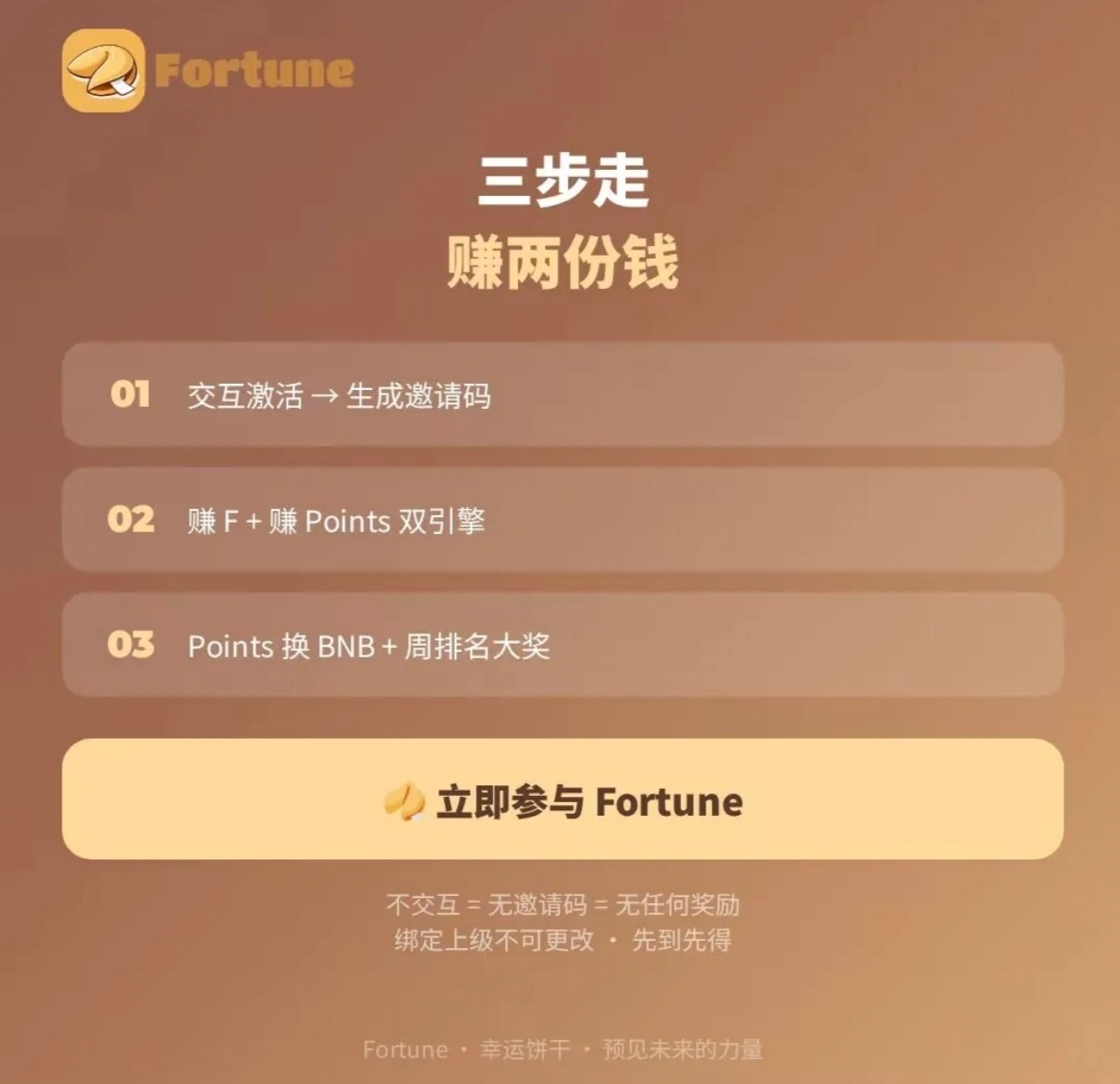 错过了OTM不要错过幸运协议Fortune Protocol:Web3预测市场新基建,测试kong投来袭!参与即赚,裂变躺赢BNB,今天刚开始。