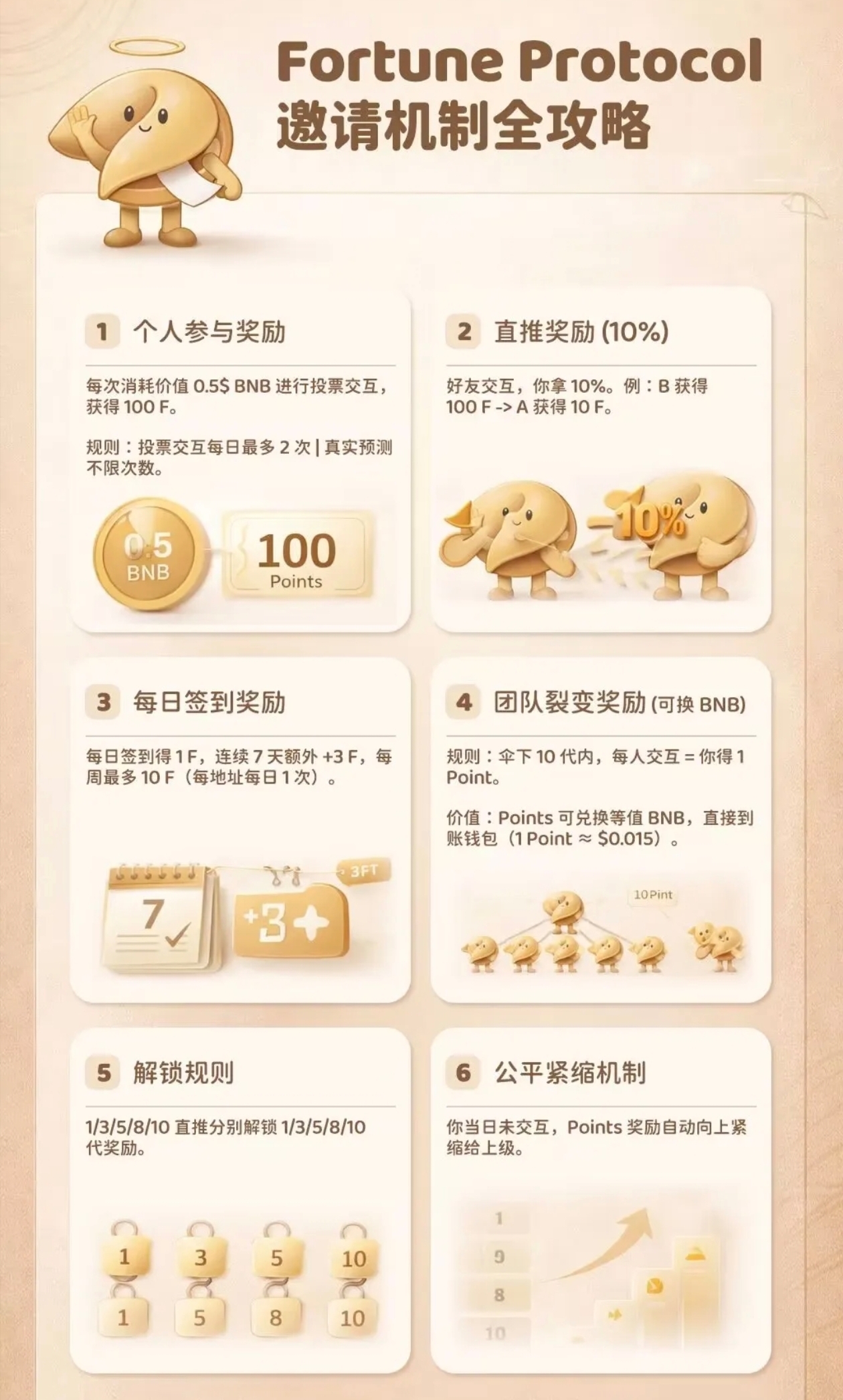 重要规则:划重点,不踩坑 动态账户每日完成1次交互,即可激活当日动态收益,未交互将紧缩上级权益,每日随手操作,福利不丢失;直推用户每日有10个有效用户完成交互,即可解锁10层关系收益,轻松拉满裂变福利! Web3风口已至,幸运协议不容错过