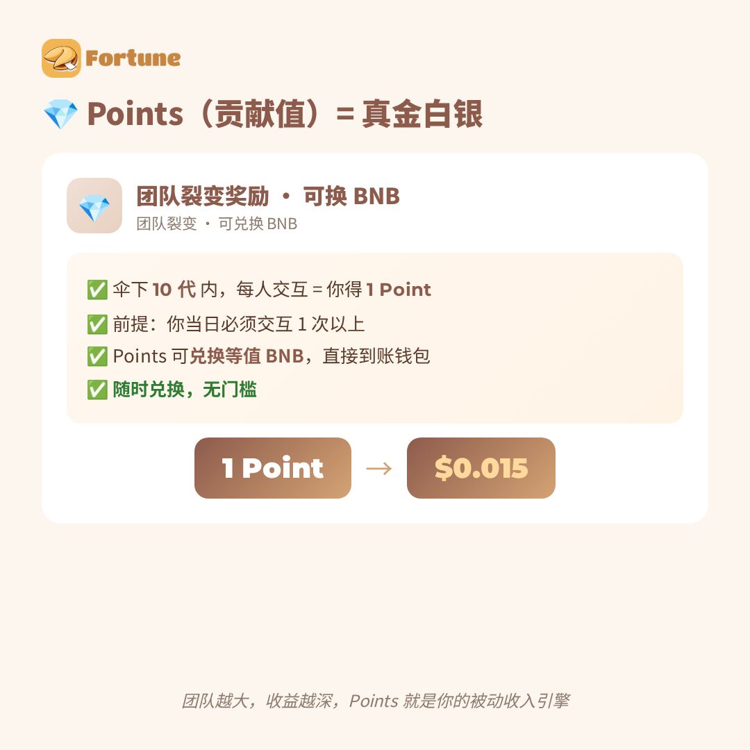 三、团队裂变躺赢,贡献值直接兑BNB 解锁邀请裂变,最高可享10代收益,直推、间推都有奖,贡献值1:1兑换BNB(1贡献值=0.015$BNB),无门槛体现,裂变越多赚得越多,管道收益轻松拿捏!