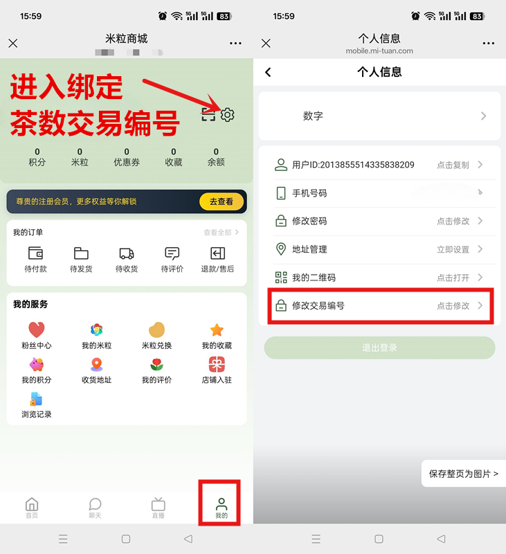 一、先注册米粒商城(我的界面最右上角绑定茶数交易编号)