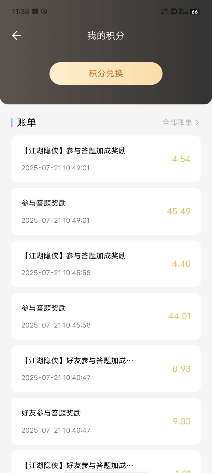 比如说我现在是江湖隐侠的等级你给我答题你得了100我也得了一百但是我是江湖这个等级在额外获得百分之十也就就是10个积分奖励