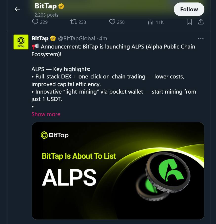 庆祝阿尔法ALPS上BitTap交以所