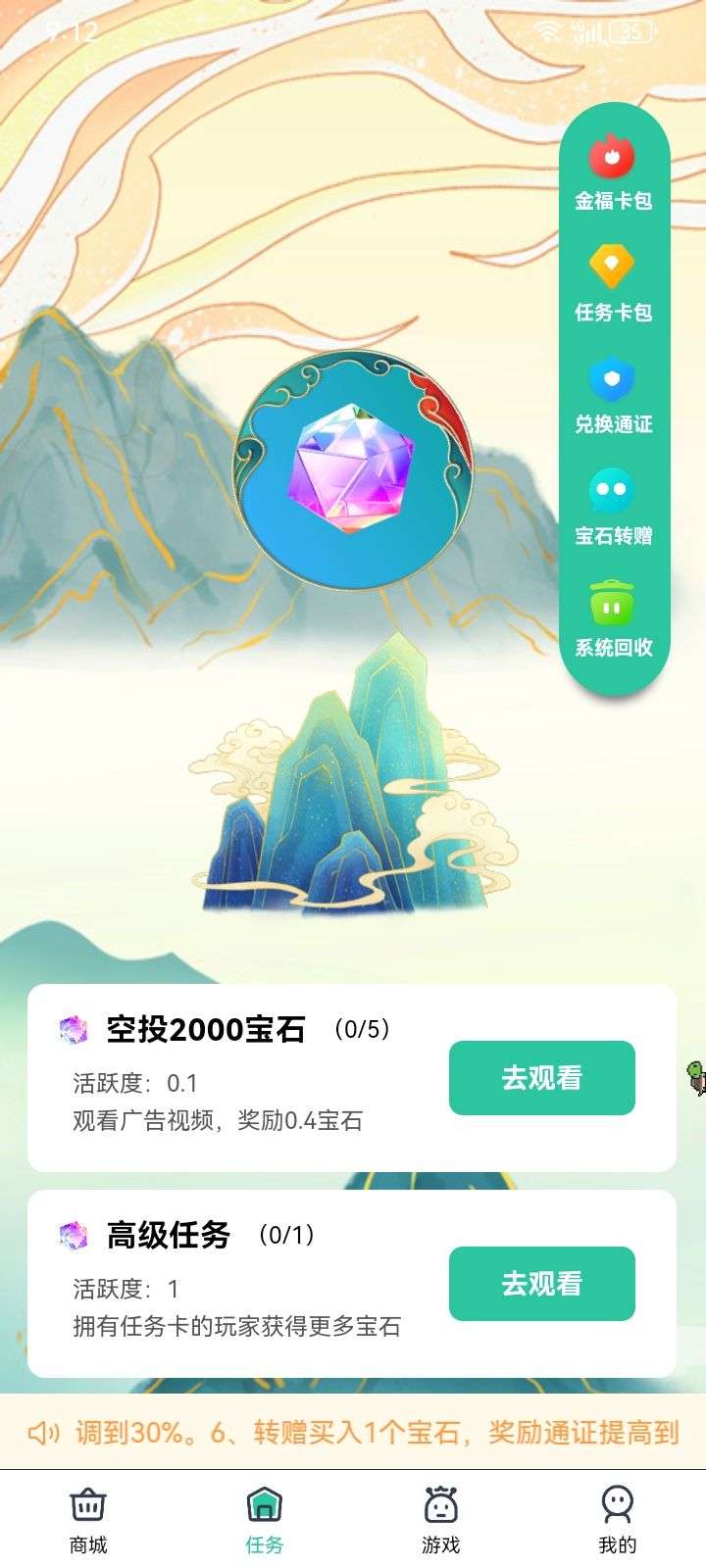 - 入门福利:《国潮宝石版》用户完成注册实铭即kong投2000宝石+0.66元钱红包,每日观看少量广告即可释放宝石,宝石估价3元/个,支持1个起转增,流通性灵活。