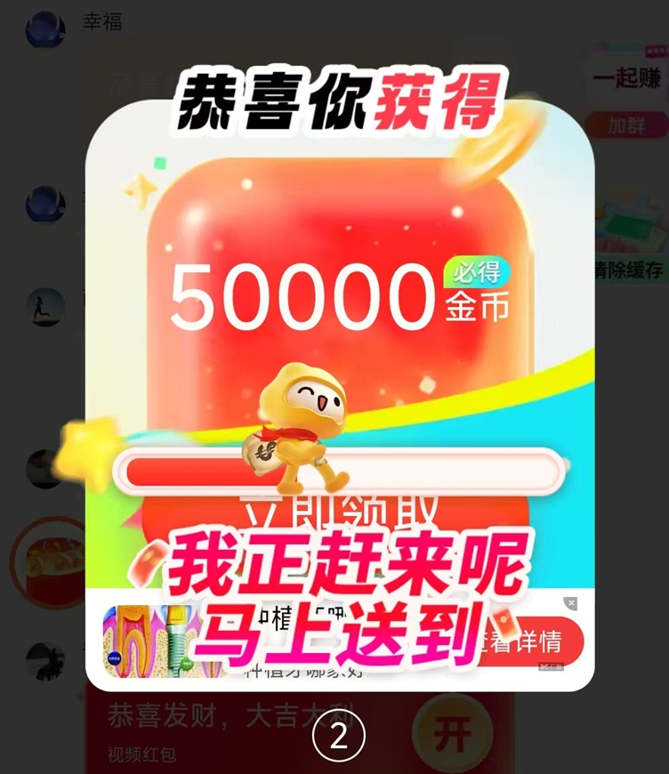 先说说疯狂夺宝基础玩法,进入APP之后,去首页静置两分钟,然后等跳广,悬浮窗满了之后可以点开领取,注意不满5W金B别领,如果不满就叉掉,叉掉之后会跳出一个广,让它放15秒再关掉,如果是商业类广就再点进去看看。