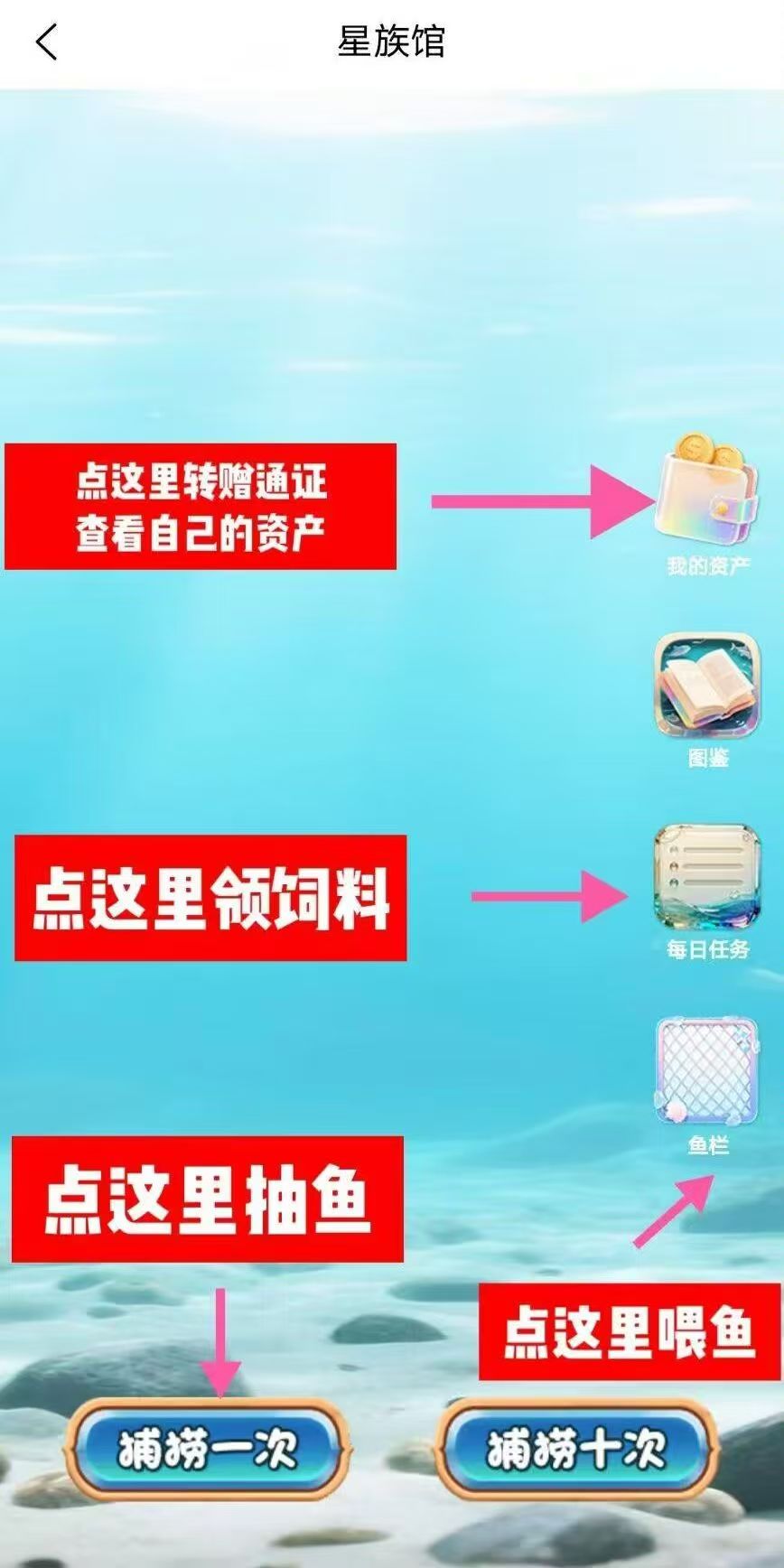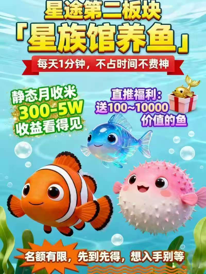 星族馆养鱼其实很简单,零撸。就是捕一条鱼,随机可以捕到价值1000到10000的鱼,然后每天做任务🉐饲料喂养产通证,铲出来的通证可以卖💰,市场80左右一个收,后期上几百一个,也可以继续捕鱼养鱼。