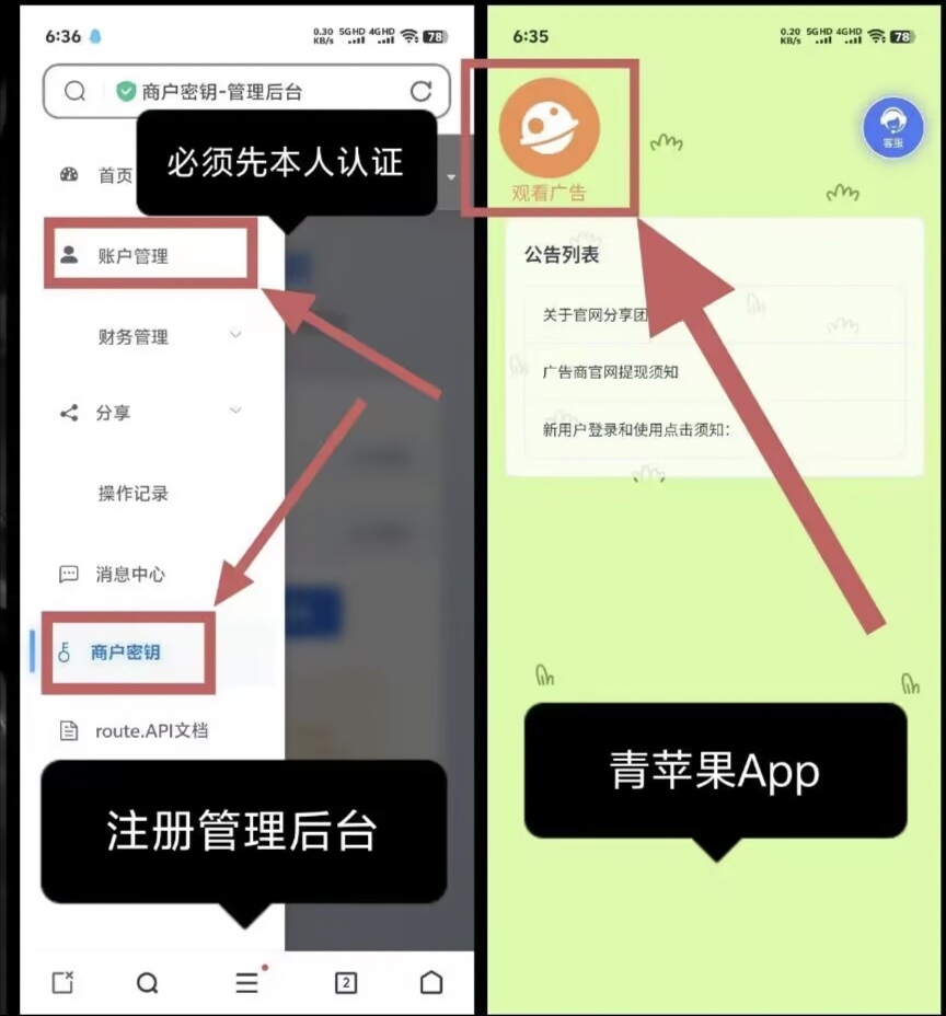 第二步:完成注册后,扫码下载青苹果app,然后从官网复制商户密钥粘贴到青苹果(实铭后才有密钥),完成青苹果跟官网账号的绑定。