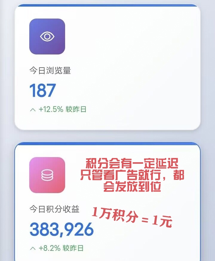 注意:一机一号一IP,请不要违规操作!不然会被广告商发现异常,导致账号被封禁,建议每天观看广告60个左右,上限100个广告。
