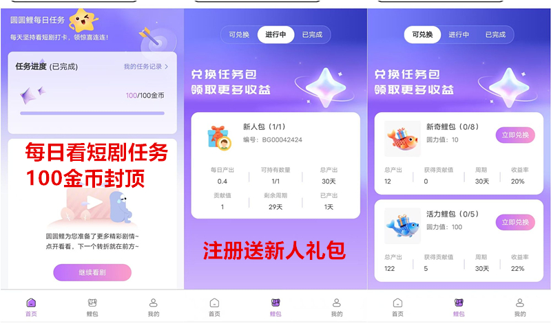 四、鲤包(注册就送新人任务包每天释放0.4个圆力)可复投更多包