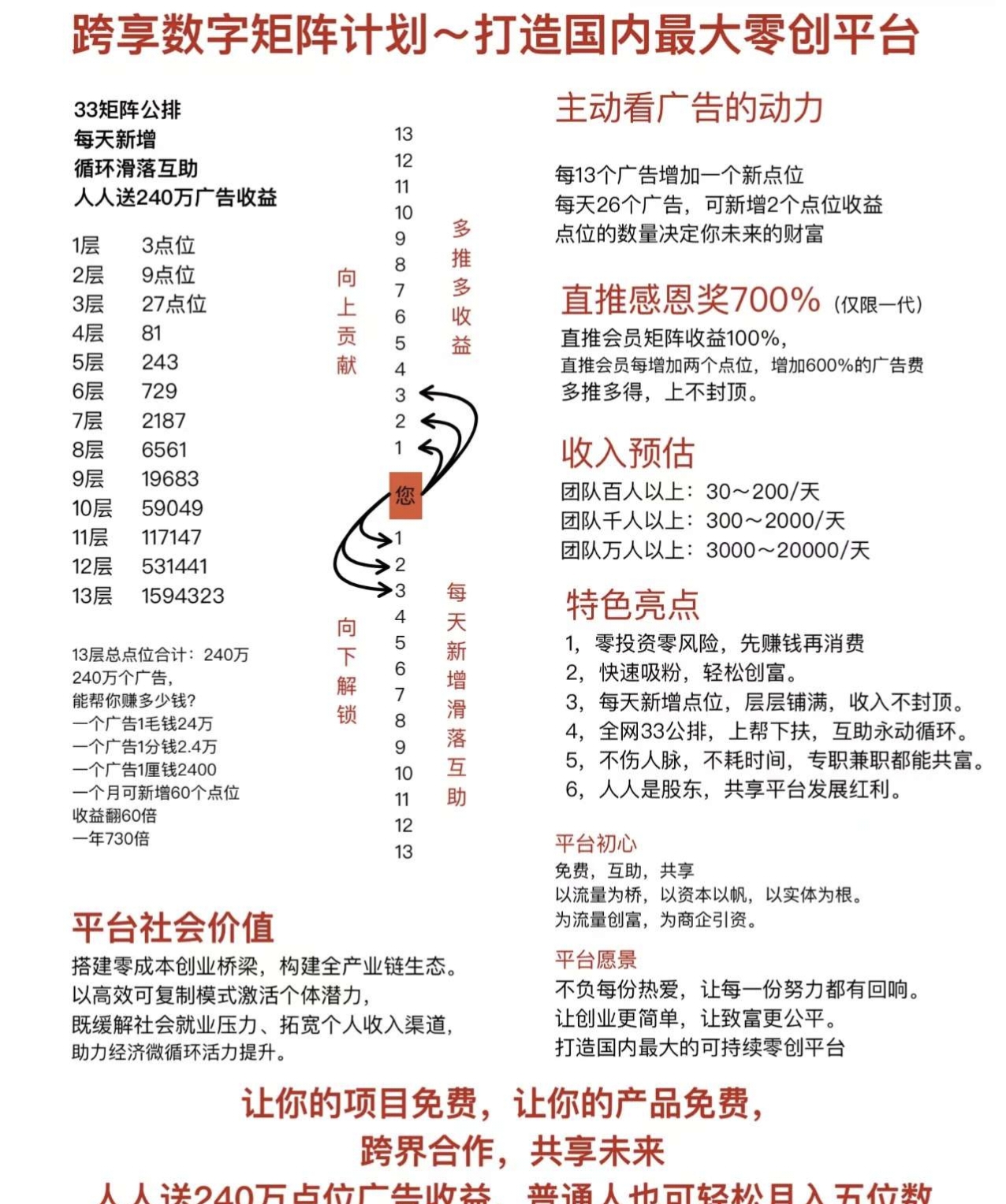 跨享首码锁粉期全网三三复制大公排! 2026年01月09日 219 zhuzi123 发消息 全网锁粉中,App月底上线 全网三三复制13层全网大公排 每看13个广告送一个占位点 26个送两个点 13层全网大公排滑落 大公排不推广也有滑落 现在刚开放注册抓紧先占位,目前不到千人抓紧喽 QQ2734517028 对本文有疑问,请注册登录后,发消息,联系作者! 交流QQ群:1147670845,交流首码app:首推啦 文章来源: zhuzi123 本文地址: https://www.shoumaquan.com/post/86126.html