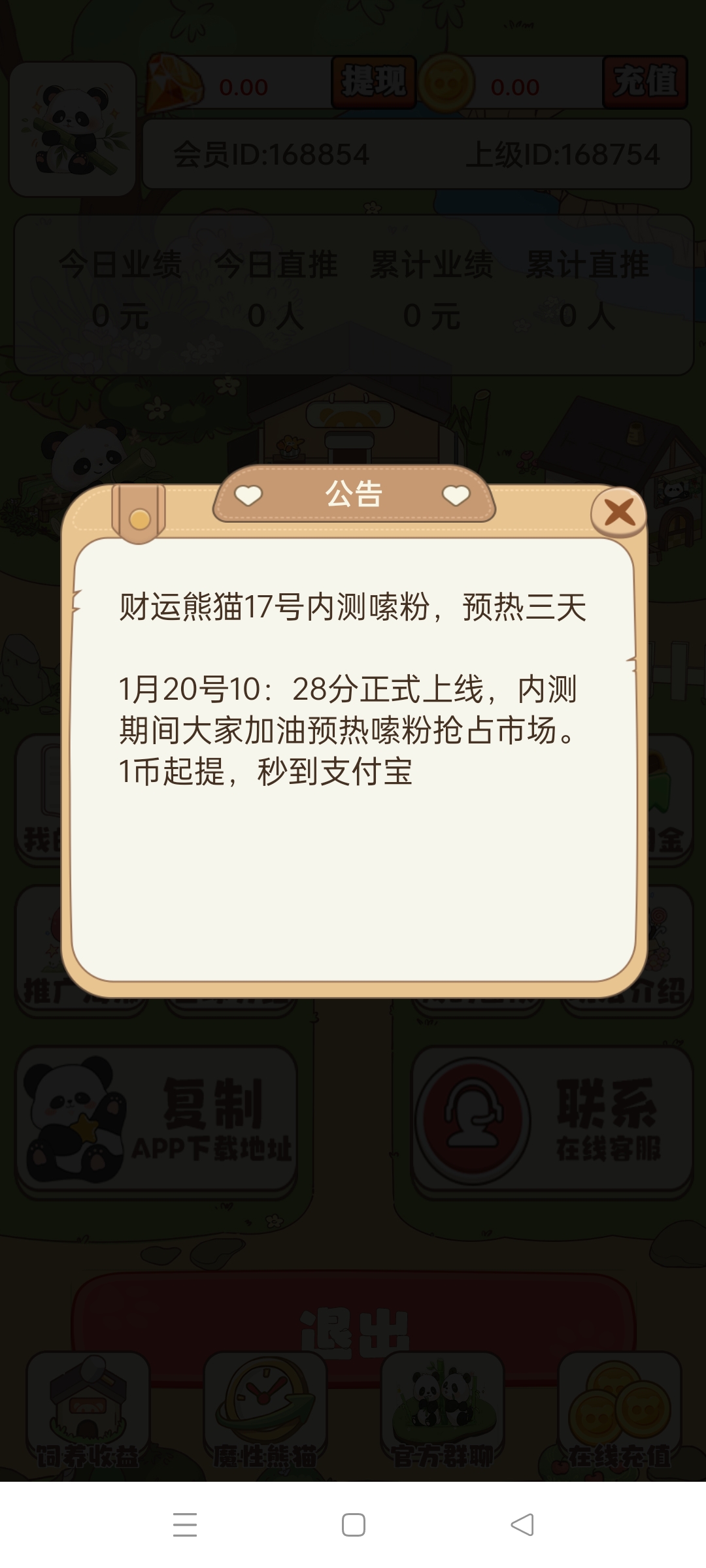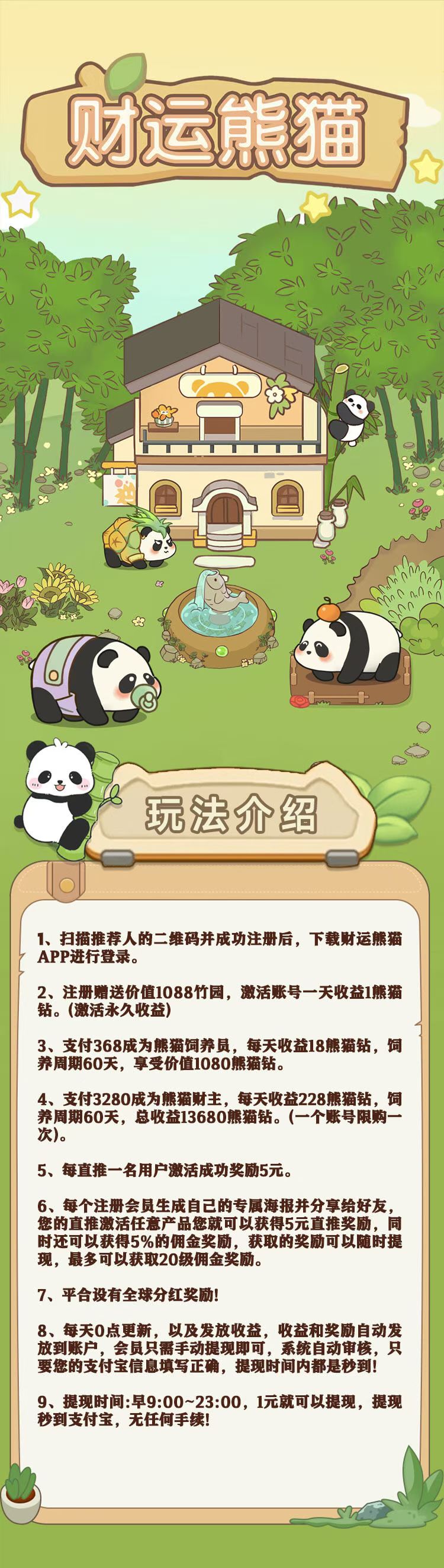 财运熊猫抢先注册1月20号上线送1088元,全新模式每天0点收益,每天可体现收益,本金自由到期可退!注册激活有扶持