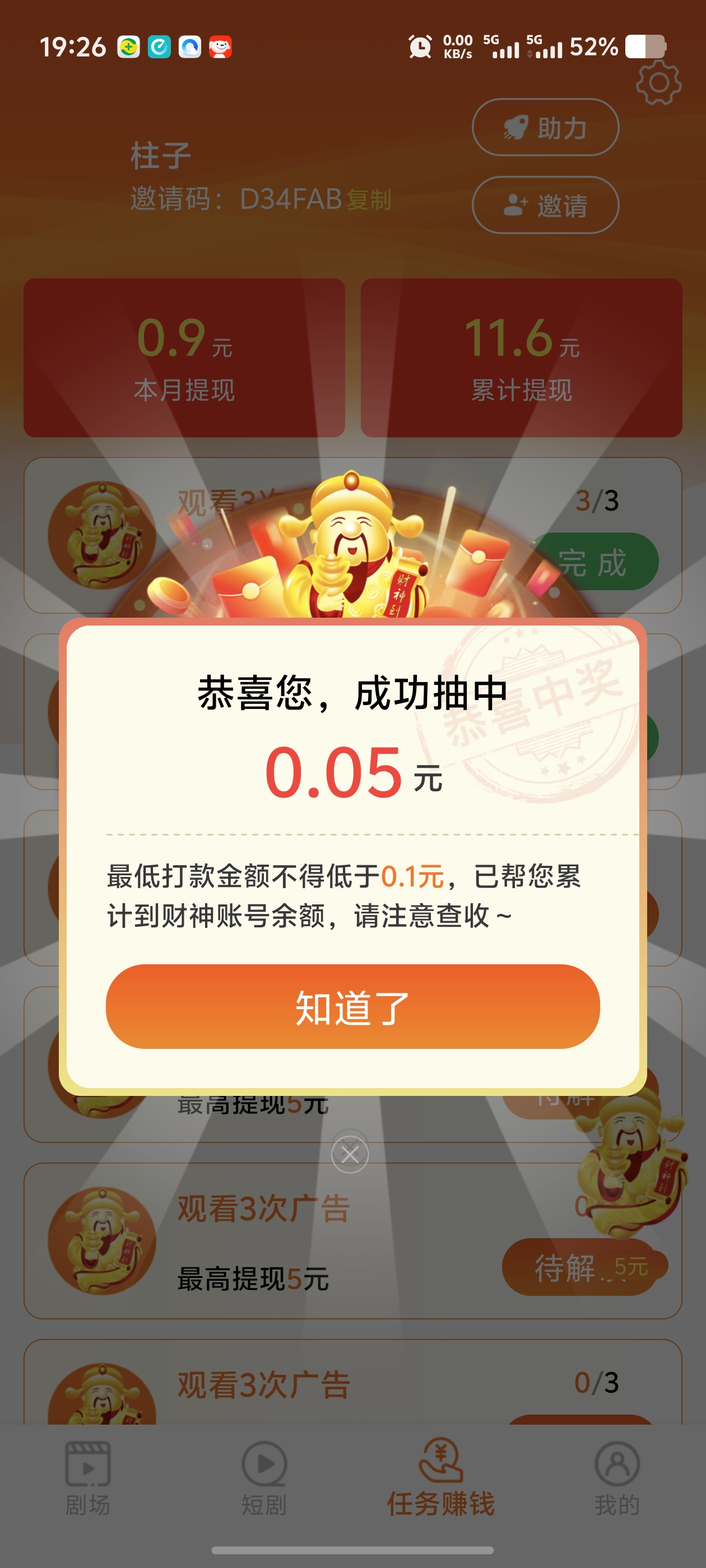 闲映极速版看财神抽大奖邀请好友拿财神分红! 2026年01月27日 647 zhuzi123 发消息 任务赚钱每三个参与一次财神抽奖保底0.1最高五元 每天30轮 解锁短剧获得钱红包0.1-0.8不等顶包一米 邀请好友拿财神分红 好友解锁短剧你获得一比一提成财神抽奖也是一样 QQ2734517028 对本文有疑问,请注册登录后,发消息,联系作者! 交流QQ群:1147670845,交流首码app:首推啦 文章来源: zhuzi123 本文地址: https://www.shoumaquan.com/post/86406.html