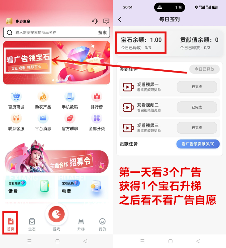 二、首页看3个视频获得1个宝石(第一天看广告 之后自愿)