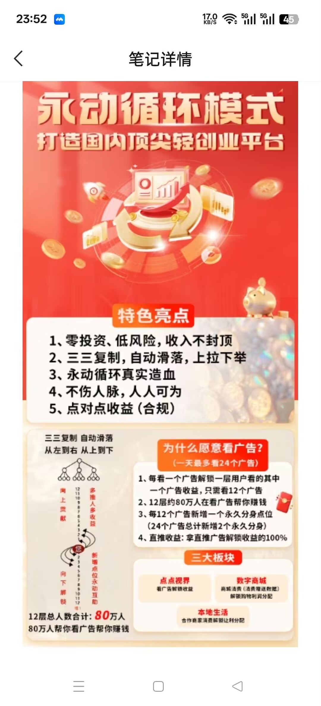 1.解锁收益:每看一条解锁伞下一层收益,33裂变,1……12层(80万)比如:1分乘80万人=8000元/天