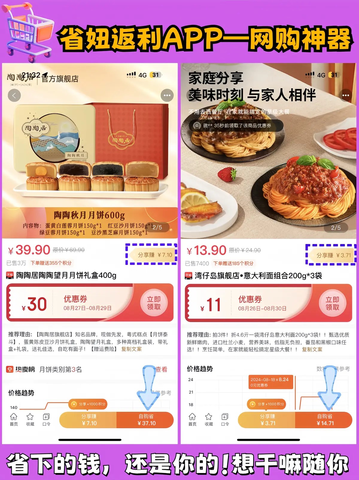 3. 领券跳转下单:点击“自购省”领取优惠券,自动跳转回原平台***,确认收货后返利自动到账,满1元即可体现,0手*费、支*付宝秒到账。