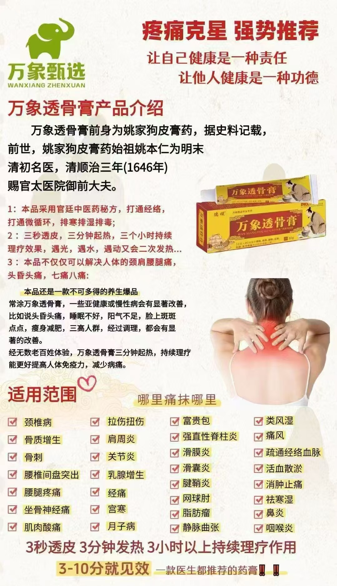 四,一分钟透皮,三分钟透骨,三小时持续发热缓解痛!可以当场试用有效才卖的产品。不来虚的。无套路,是我们老百姓都用的到的产品,久坐办公室,长久劳作,哪里有伤痛,直接抹就行。见效快。市场大,亲民产品,
