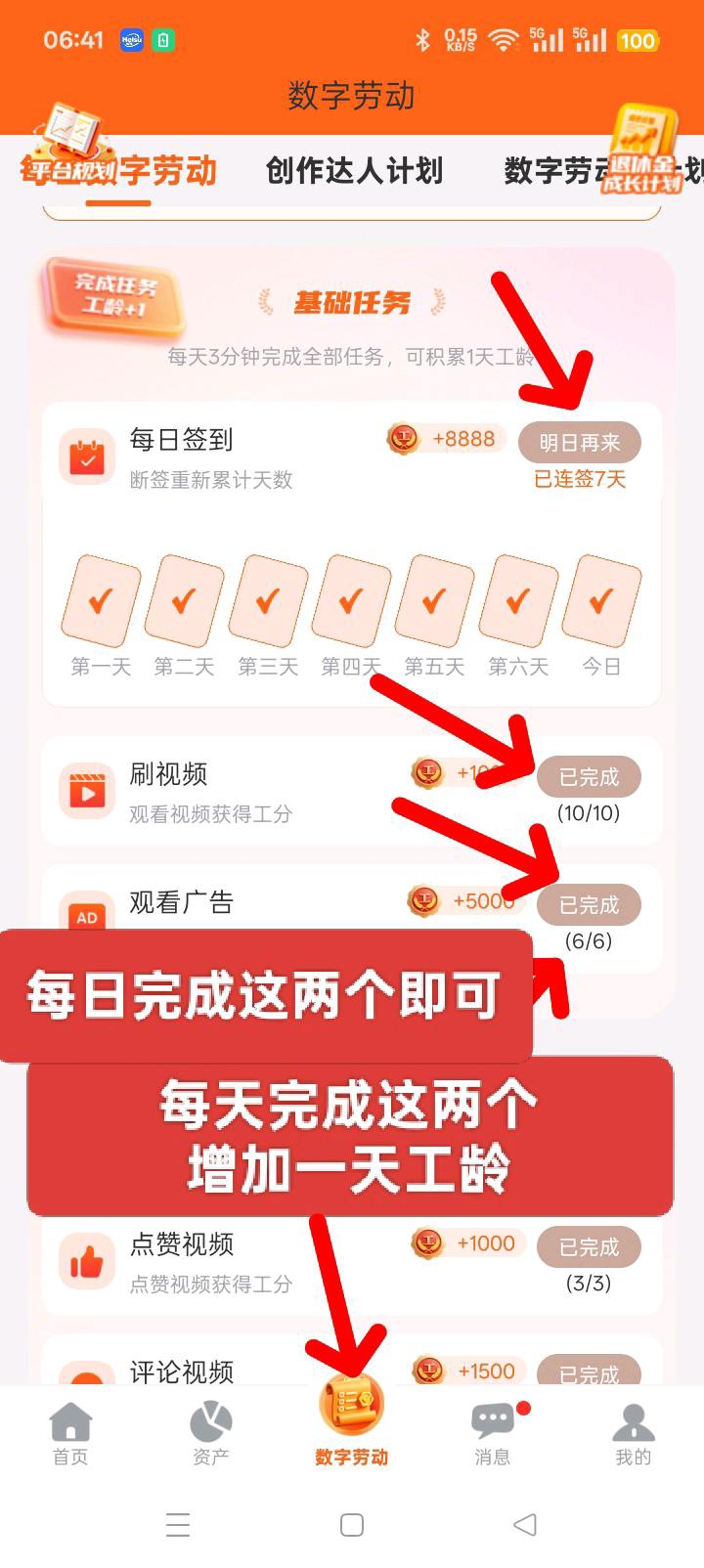(2)数字劳动页面签到下面观看六个广告即可👈至少25一天!