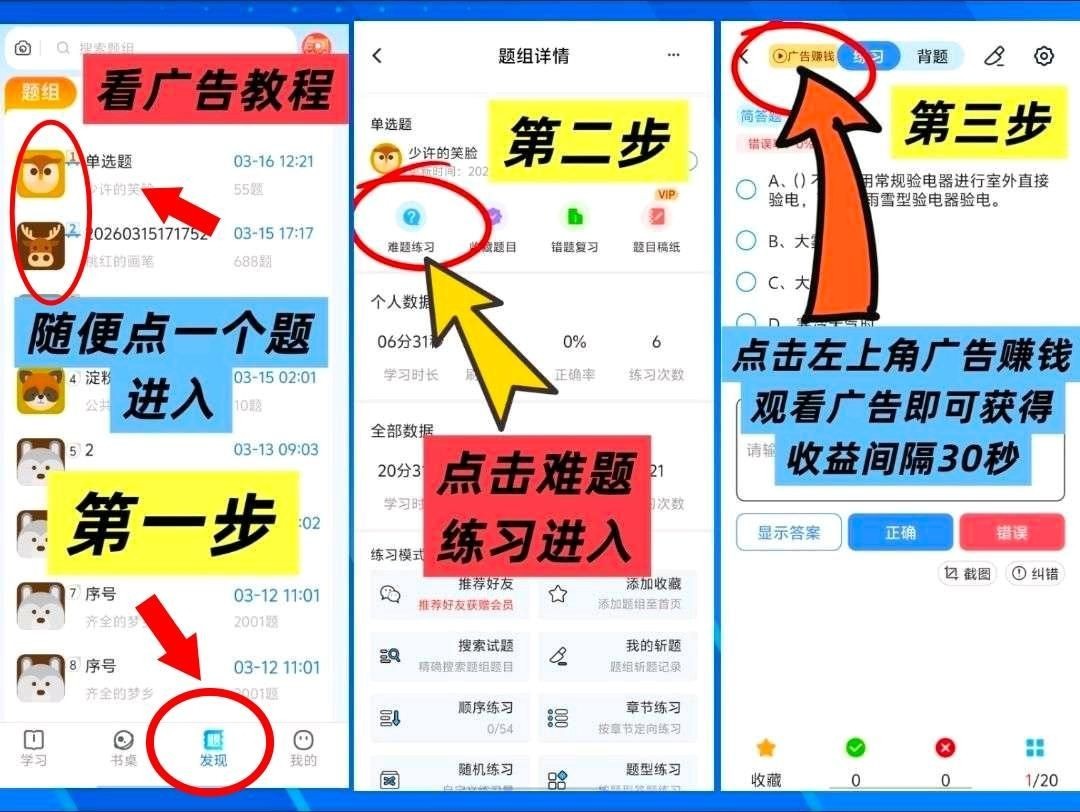 在发现页面~题组-难题练习-左上角看广告赚钱