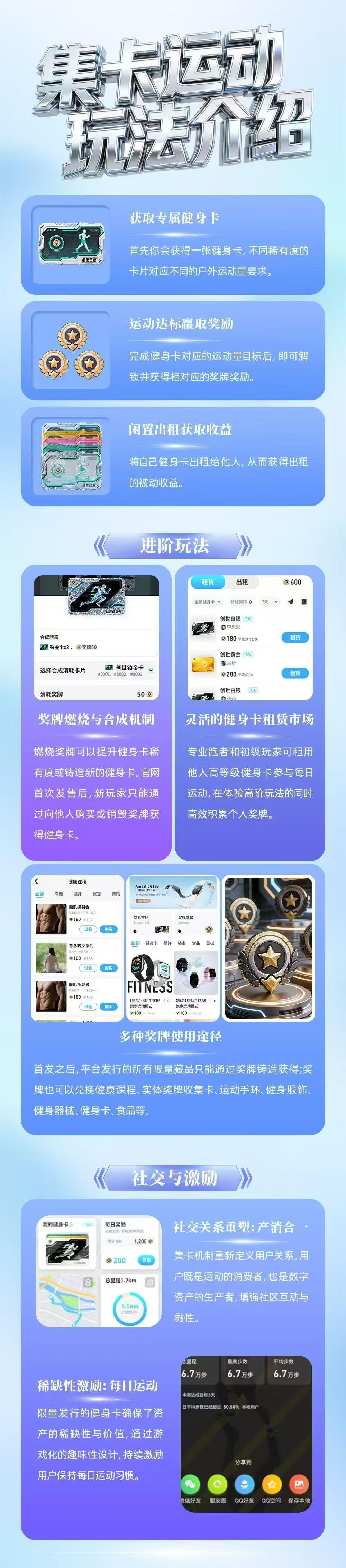 创世首发的健身卡系列,不仅是入场凭证,更是长期生态的核心载体:不同稀有度的卡片对应差异化户外运动要求,完成运动目标即可解锁对应奖励;后续还将通过砖石合成、奖牌销毁兑换等机制,保障创世藏品的稀缺性与流通性。