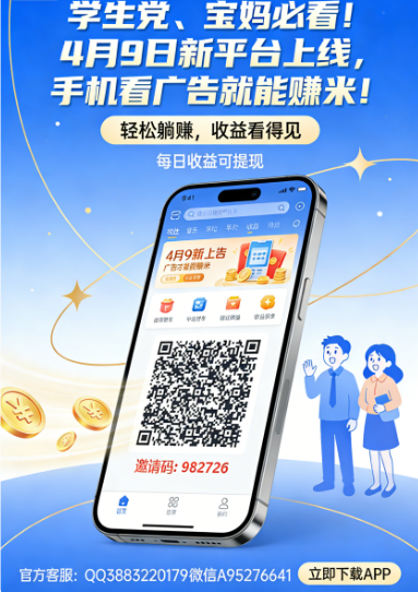 学生党、宝妈速看!4.9新平台上线,看广告赚米,同步招募代理!