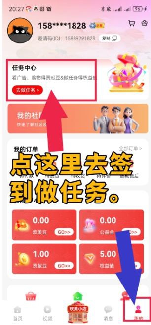 二,点击我的~任务中心,签到,看视频赚贡献豆,推广赚权益值(权益值相当于体现额度)