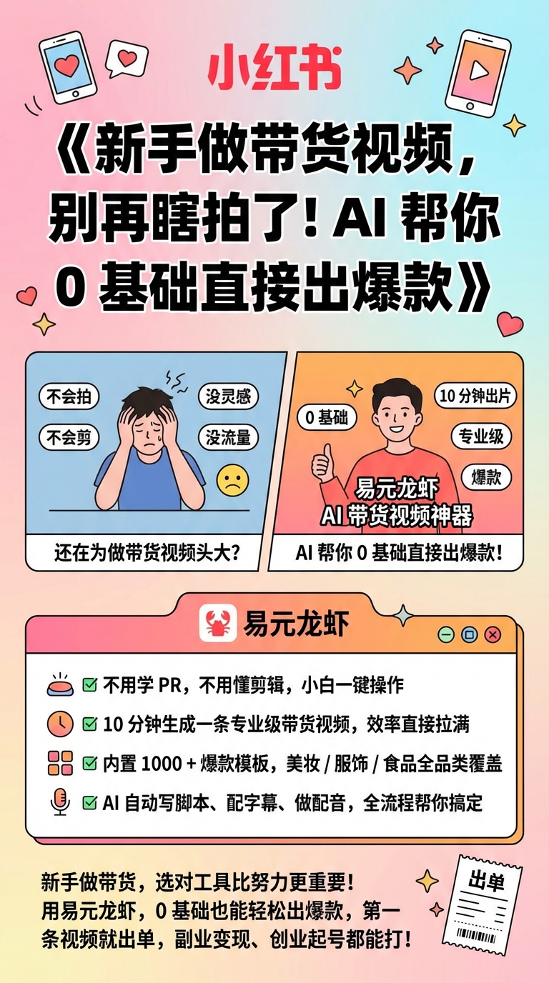 易元龙虾是什么?以前做带货视频,要写脚本、拍素材、剪片子、加字幕,折腾一天不一定有结果。现在,你只需要做一件事:上传一张产品图。剩下的脚本、视频、数字人、字幕、图文,AI全部自动搞定。4月17日新功能正式上线——从这天起,让易元龙虾替你干活,你坐等收益到账!那么易元龙虾邀请码是多少?易元龙虾APP邀请码是VSZ4S3