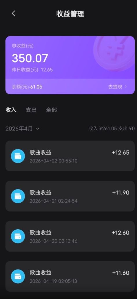 4,平台额外奖励:咱们平台会根据你做歌的活跃度、贡献值,给你额外的钱或者流量奖励,多做多得。