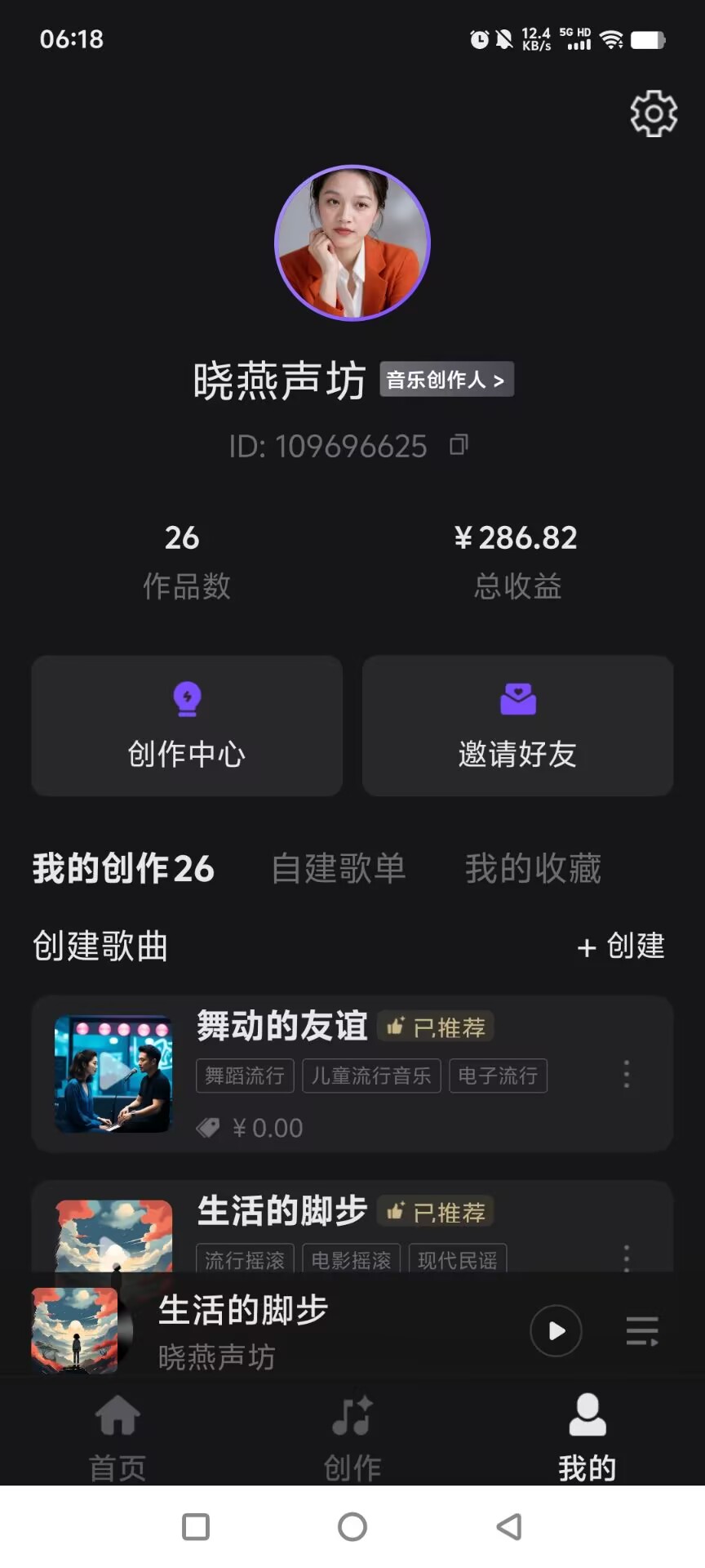 2.点APP最下面栏的创作键,然后点AI创作,也可以自己写歌曲输入,生成歌曲.一键创作歌曲!