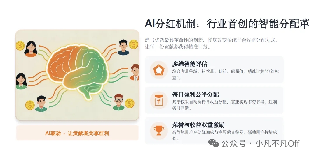 个人任务奖励:每日简单任务,钱即时到账粉丝团队分红:直推 + 团队级差收益,团队越大、被动收入越高AI 智能分红:共享平台整体利润,不干活也能躺赚周周乐红包:每周固定瓜分,额外惊喜不断AI 带货高额佣金:AI 一键生成带货视频,分享即赚高佣